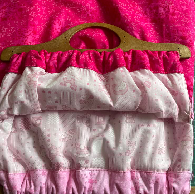 This very ‘pink’ sewing or knitting bag is created from 2 pieces of pink cotton in the same floral design but in 2 different hues.