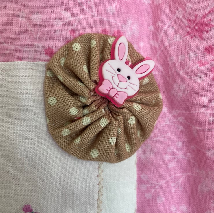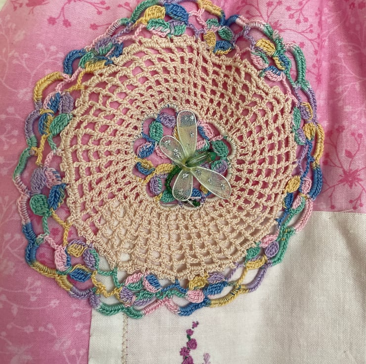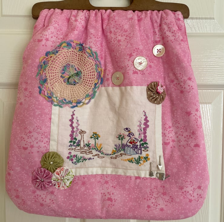 The front of the bag is decorated with a piece of hand embroidered linen with a garden and crinoline lady design in a variety of colours with embellishments of metal charms, a broom, spade and watering can. Suffolk puffs with pearl centres, a pink plastic bunny, crochet doily with a green dragonfly centre and some mother of pearl buttons.