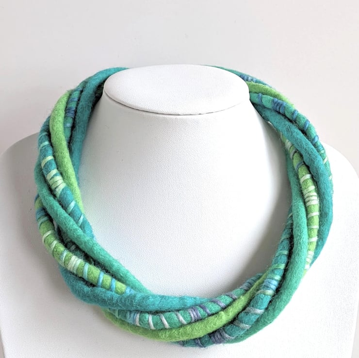 This handmade wet felted necklace twists together felted cords of soft merino wool in shades of spring green, mint, and bright jade, wrapped with a toning lustrous merino and silk blend yarn. It closes with a strong magnetic fastening.