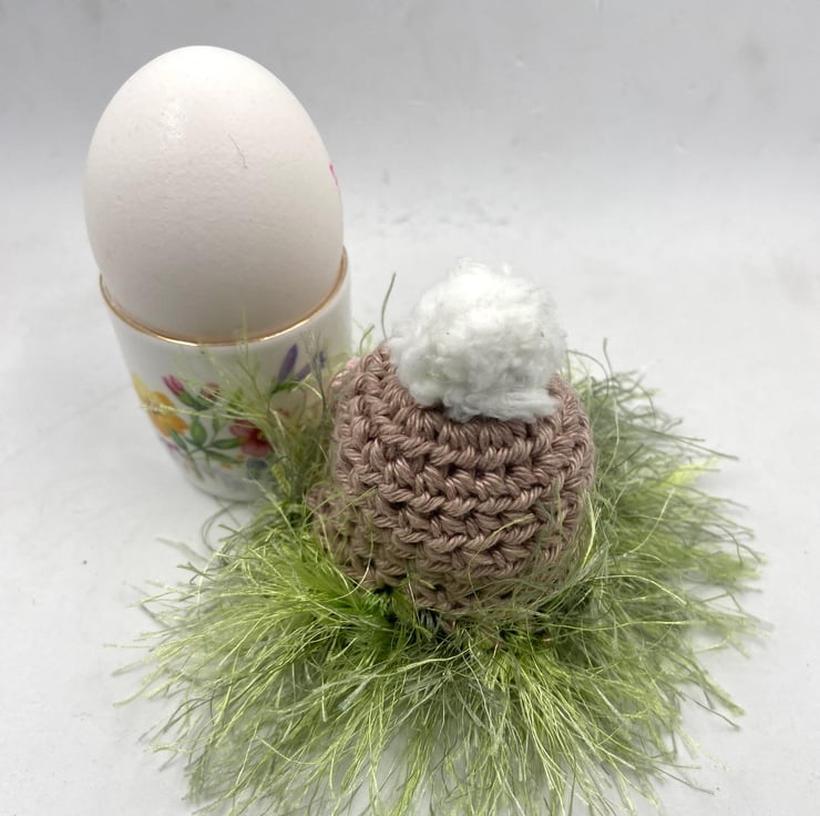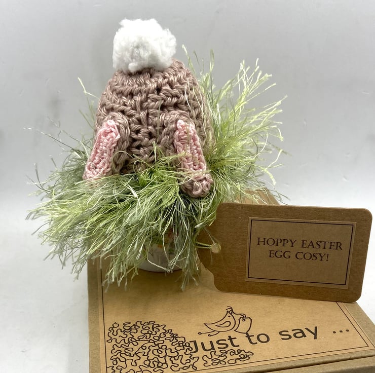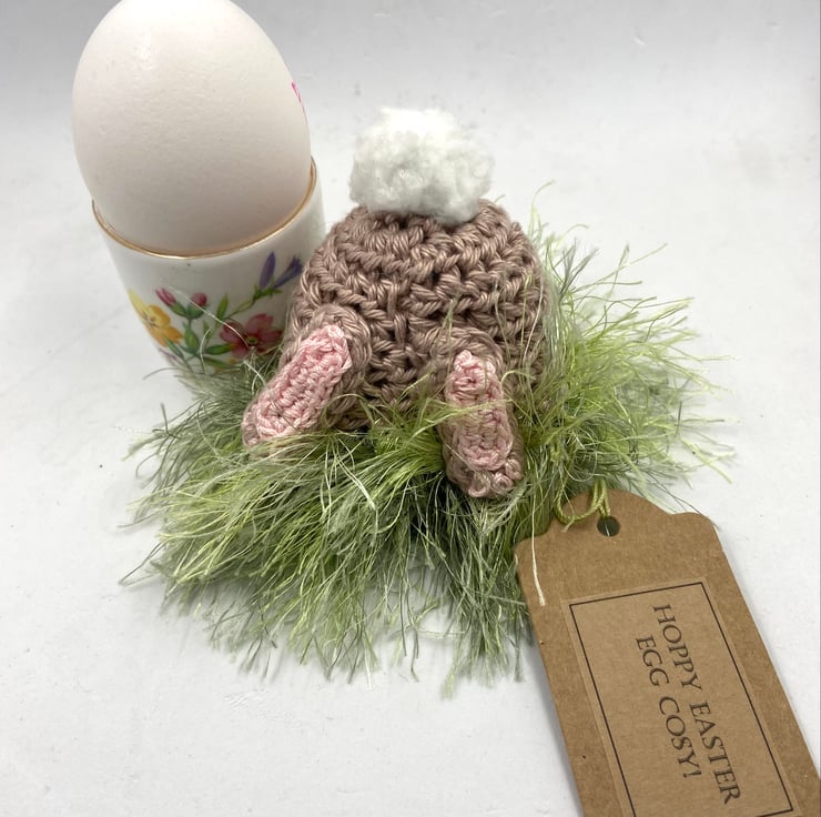 Nothing says Happy Easter quite like a bunny’s bottom! The one on this egg cosy is crocheted in cotton and has a fluffy bob tail. The grass is crocheted in green eyelash yarn. The tag reads ‘ Hoppy Easter Egg Cosy’ although I am very happy to exchange this tag for one with wording of your choice.