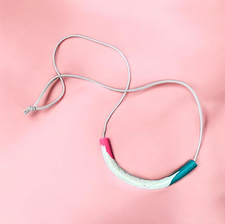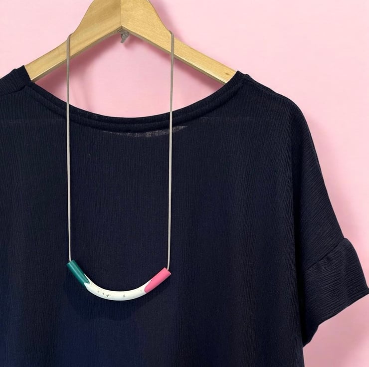 Handcrafted with care, this contemporary curve necklace is a bold blend of pink, green, and speckled white polymer clay, sculpted into a striking curved pendant. Suspended on a soft faux suede cord, this piece is a playful take on minimalist jewellery, perfect for those who love to mix colour with clean, modern design.