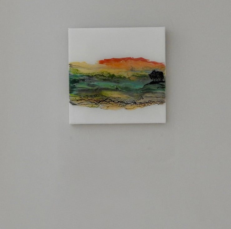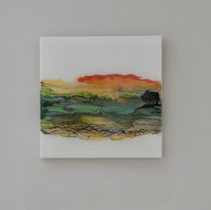A fluid art base enhanced by hand drawn trees , with an autumnal glow just starting in the sky and the green hills with the rocky parts of hadrians wall in the foreground.
