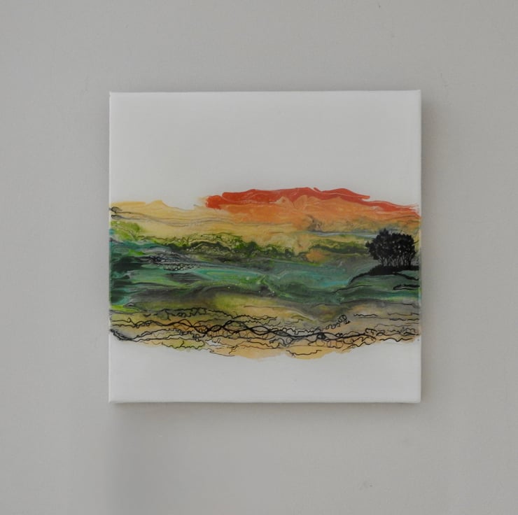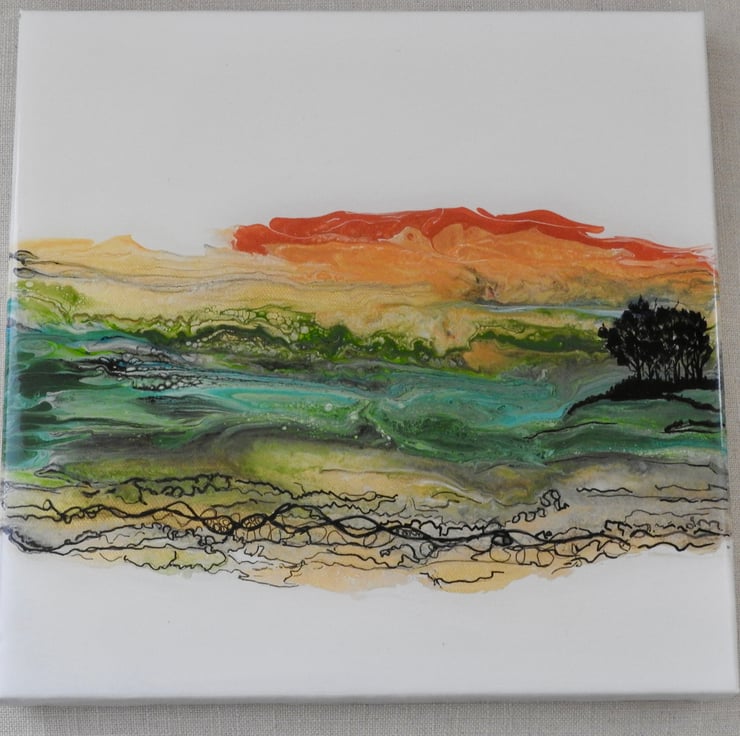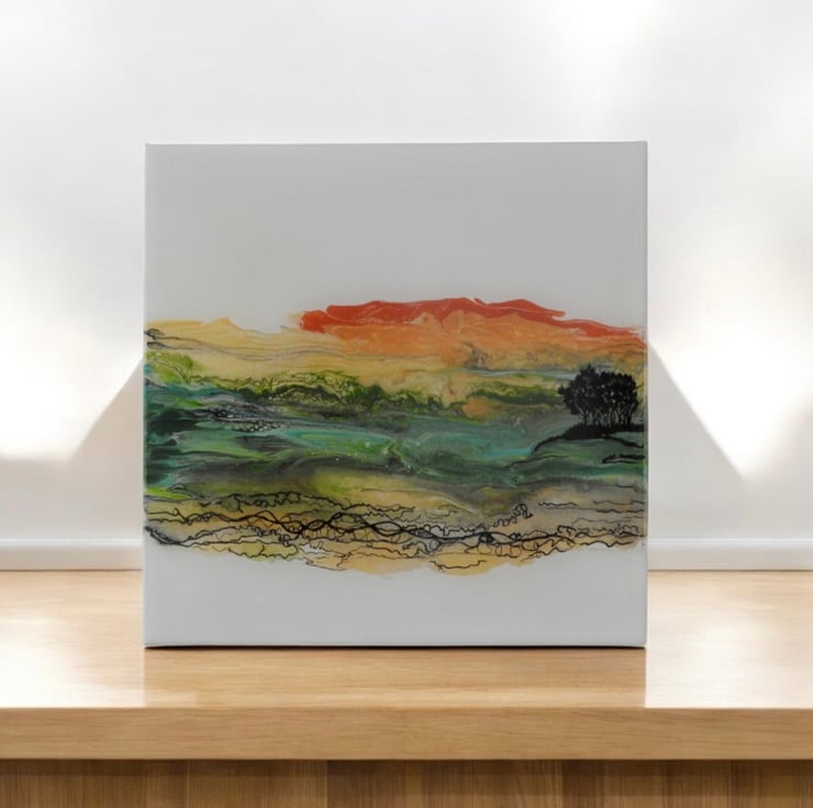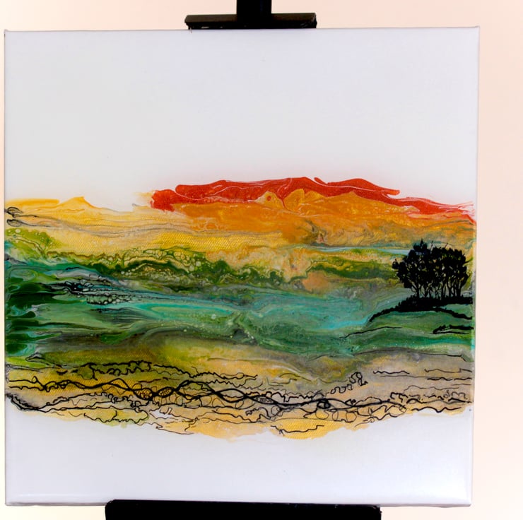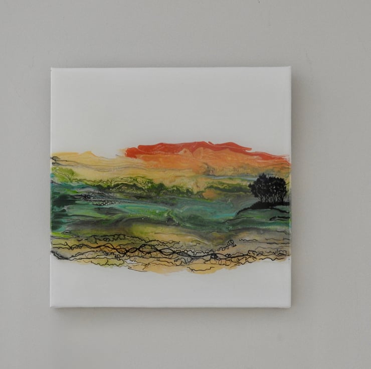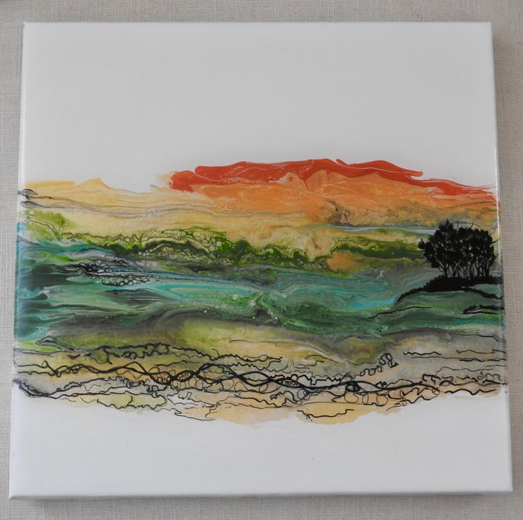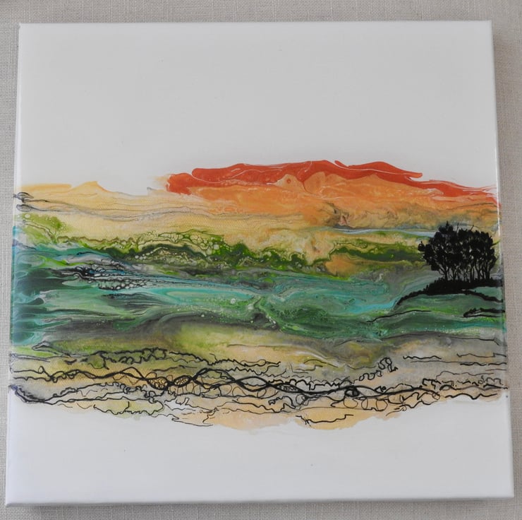 Measuring 30 cms square on canvas , an original artwork made with fluid art and traditional techniques . Finished with high gloss varnish on stretched canvas .
