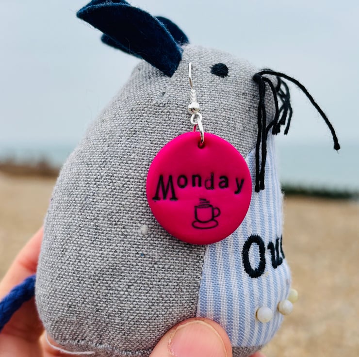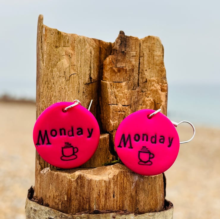 These silver plated earrings are made from polymer clay. They have an impressed design, saying ‘’Monday’ with an image of a cup of tea/coffee. They are inscribed with waterproof ink and varnished for extra durability and shine.