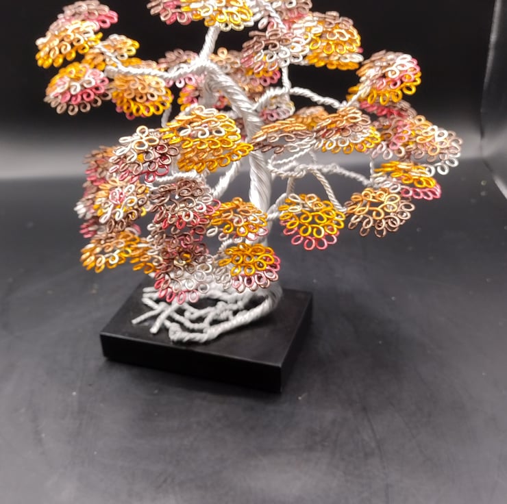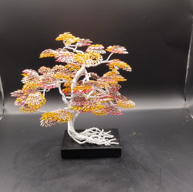 This is an interesting small bonsai tree, the trunk and branches are made of silver aluminium wire, and the leaves are made of mixture of gold and yellow with different shades of each, the trunk and branches are delicately twisted around to create a realistic effect, and then the leaves are made by a different technique of rolling the wire around itself to get the effect, it is leaning and the roots are shown to give an exposed effect, the tree itself is standing on a small piece of black wood which has felt pads underneath to stop scratching on delicate surfaces .