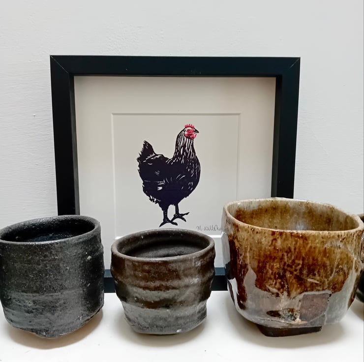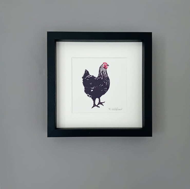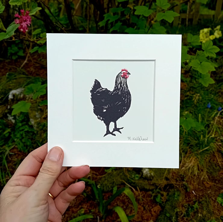 Embrace a rustic vibe with my Giclée chicken print. This little black hen was originally a Lino print, and has now been digitally reproduced as an enchanting mini print.