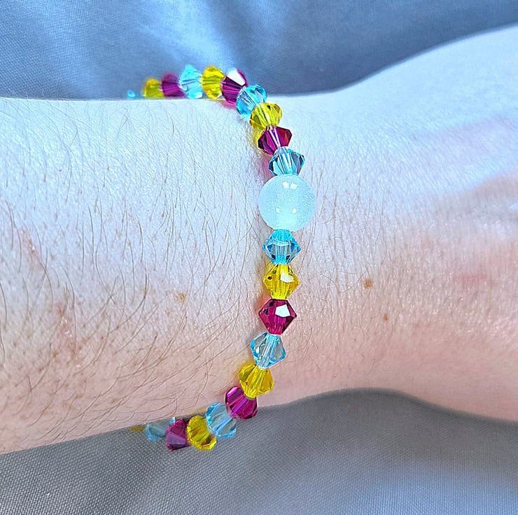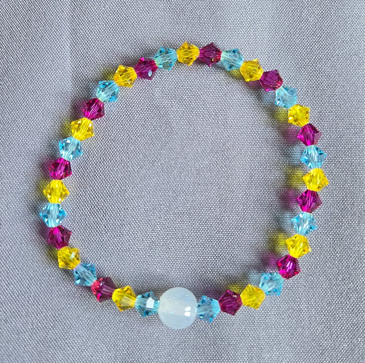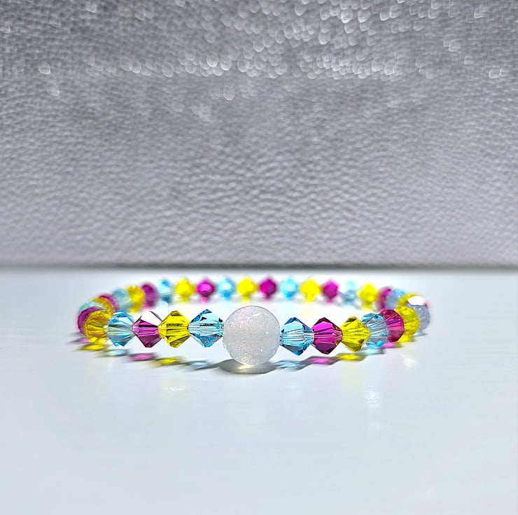 Hand made to order this super sparkly Stretchy Bracelet is made with 6mm Bicone Citrine Yellow, Aqua Blue & Fuchsia Pink Glitter Preciosa Crystals, it looks beautiful from any angle when the light hits it and is finished off with a sparkly 8mm Resin Bead giving it a bespoke luxury finish.