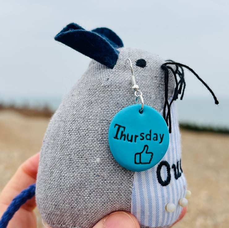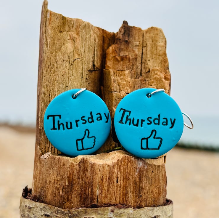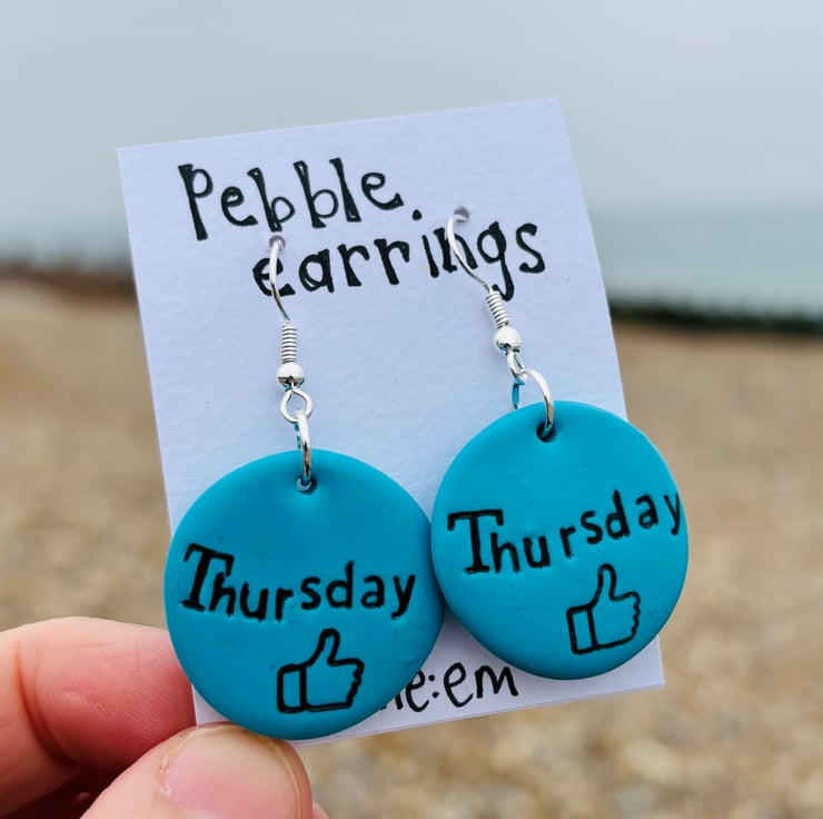 These silver plated earrings are made from polymer clay. They have an impressed design, saying ‘Thursday’ with an image of a thumbs up. They are inscribed with waterproof ink and varnished for extra durability and shine.