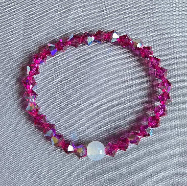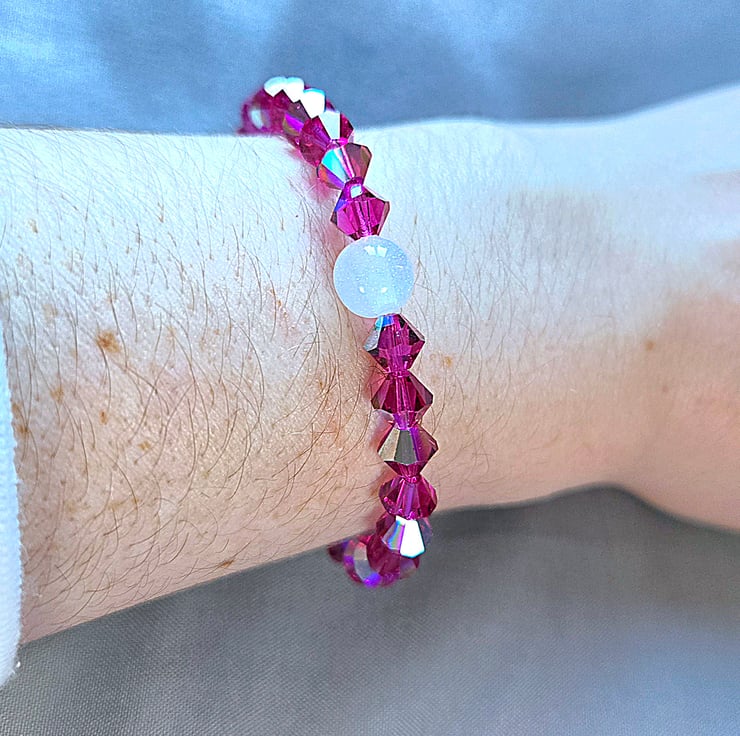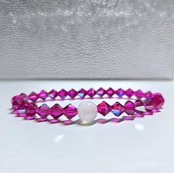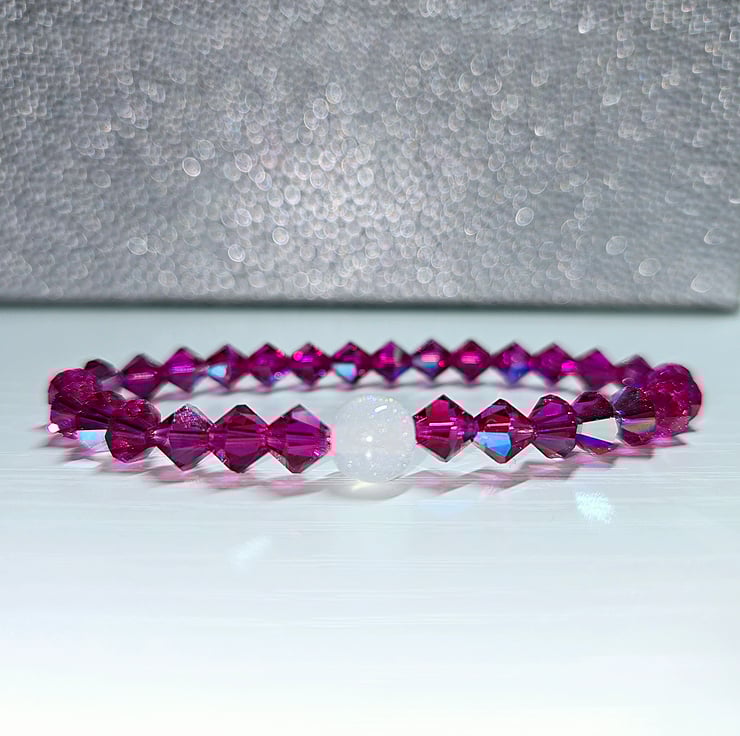 Hand made to order this super sparkly Stretchy Bracelet is made with 6mm Bicone Fuchsia Glitter Preciosa Crystals, it looks beautiful from any angle when the light hits it and is finished off with a sparkly 8mm Resin Bead giving it a bespoke luxury finish.