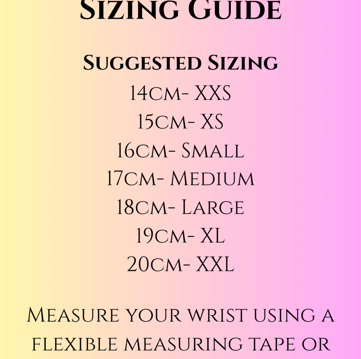 Available in 7 sizes- 14cm, 15cm, 16cm, 17cm, 18cm, 19cm & 20cm. If unsure of sizing, please measure your wrist with a flexible tape measure or string and then measure the string with a ruler. Adding a little extra for movement, depending on how tight or loose you like to wear your bracelet.