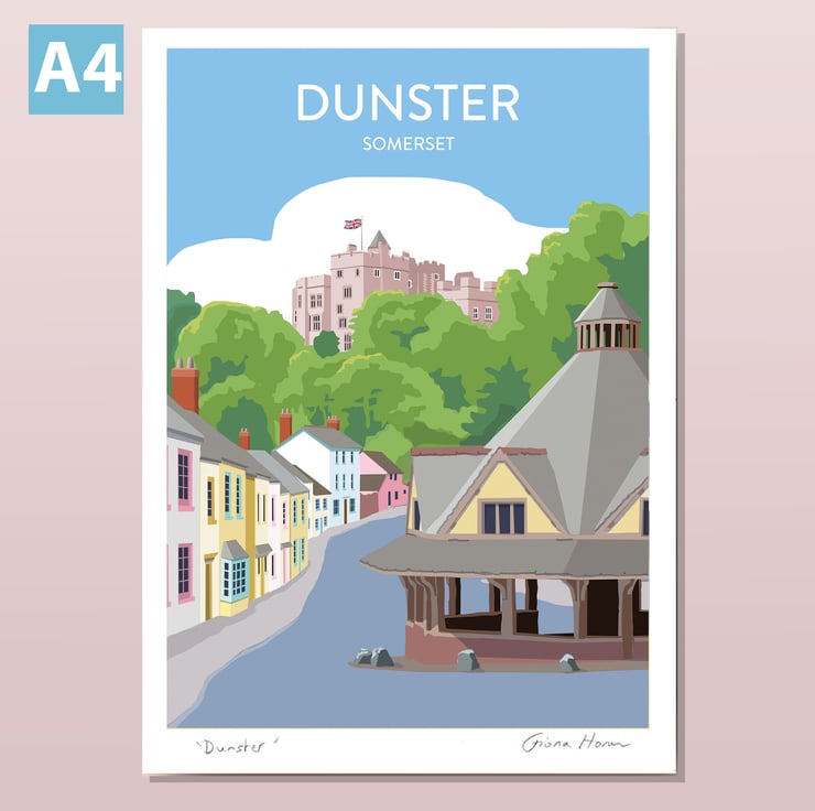 Illustrated poster of the Exmoor village of Dunster in Somerset, with its castle. My illustration harks back to traditional railway posters of beautiful British holiday destinations, and is professionally printed on quality heavyweight paper.