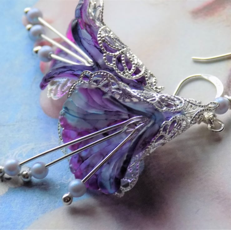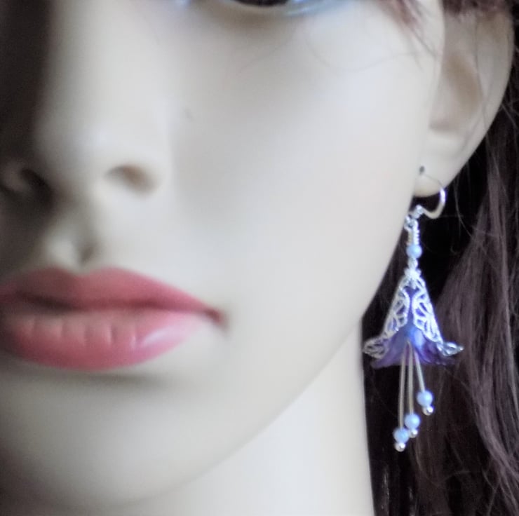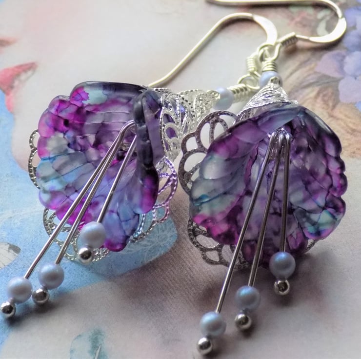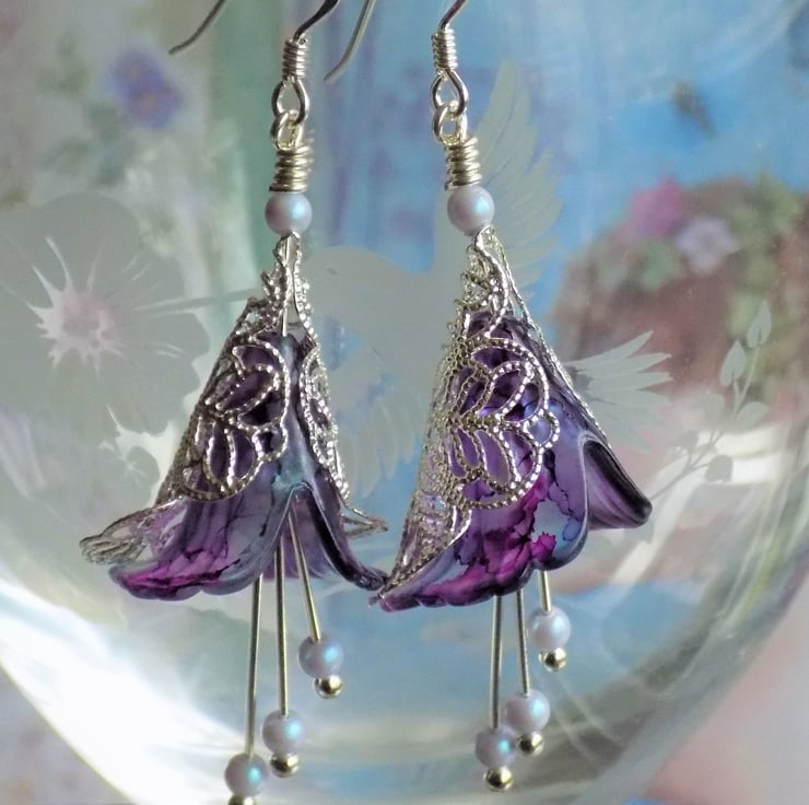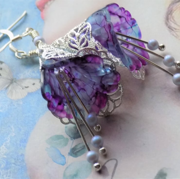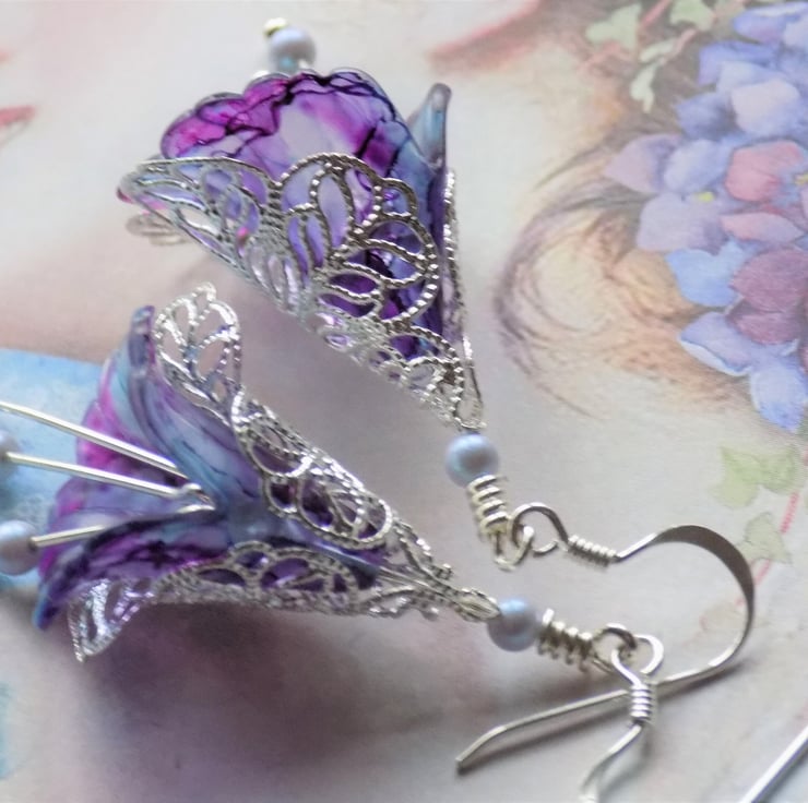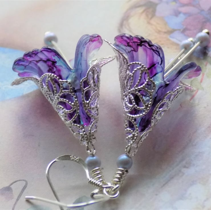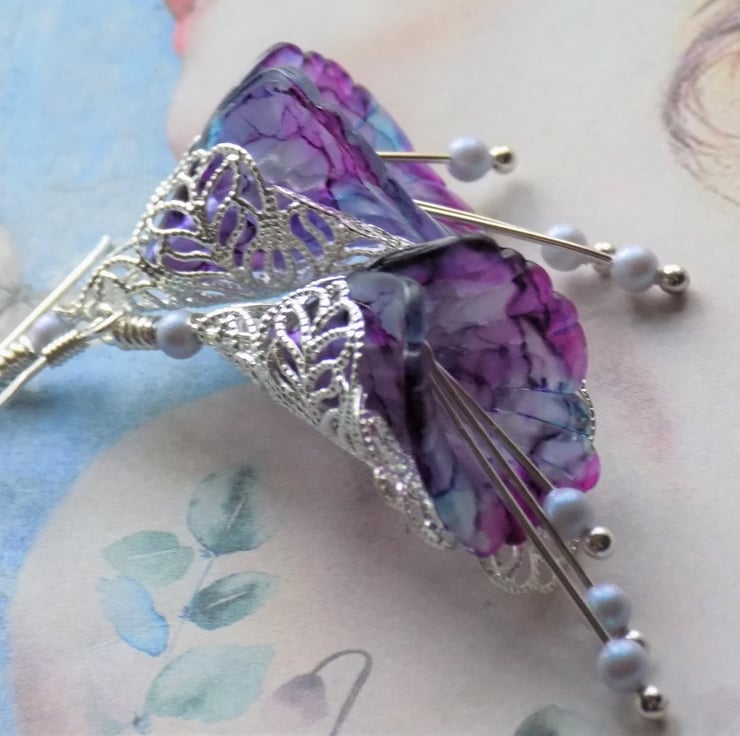 "Wisteria" are my unique hand painted lily flowers in dark purple, plum, and pale blue, all blended together to make a beautiful design. Surrounded by silver filigree wraps and featuring Swarovski Crystal Pearl stamens in Dreamy Blue, an iridescent light blue.