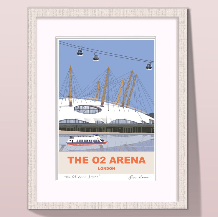 Illustrated poster of the O2 Arena beside the Thames in central London. This used to be the Millennium Dome. The picture also includes the cable cars across the Thames and a tourist boat on the river, plus, if you look closely, you can see tourists walking across the top of the dome.