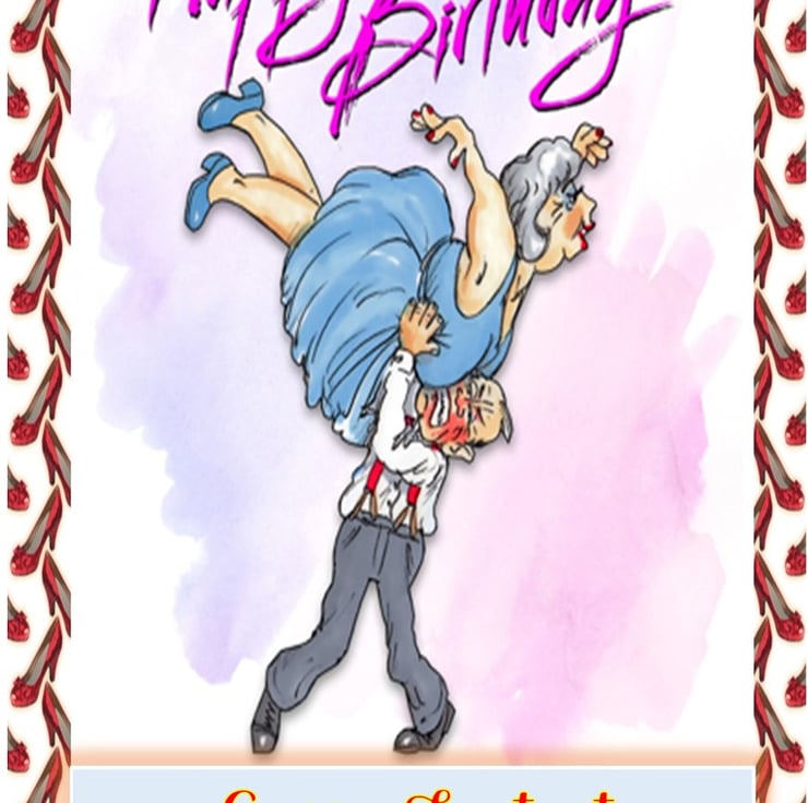 This hilarious birthday card is a playful twist on the iconic Dirty Dancing lift—only with a senior spin! Featuring a determined gentleman struggling to hoist his enthusiastic dance partner, this fun and cheeky design is perfect for anyone who embraces aging with humour and style. With a border of dazzling red heels and a splash of retro flair, it's a must-have for those who still have "the time of their life!