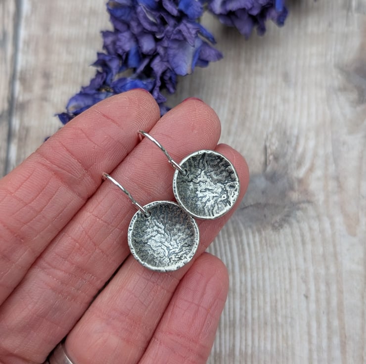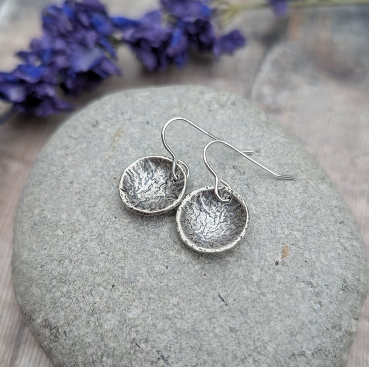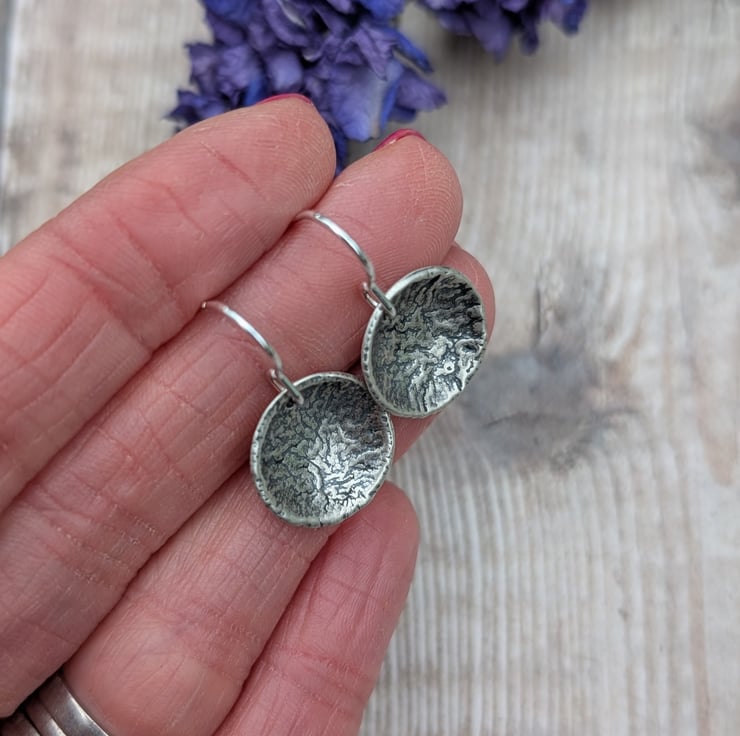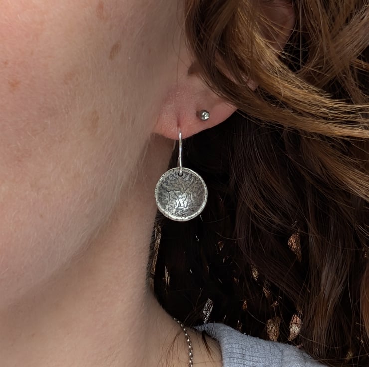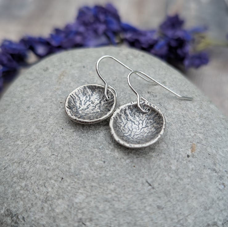 These handmade drop earrings are crafted from recycled sterling silver, featuring a beautifully organic texture created using a process called reticulation. The silver is carefully heated to create unique natural ridges and patterns, giving each pair a one-of-a-kind finish.