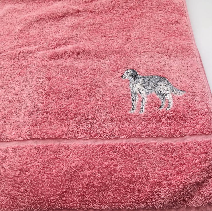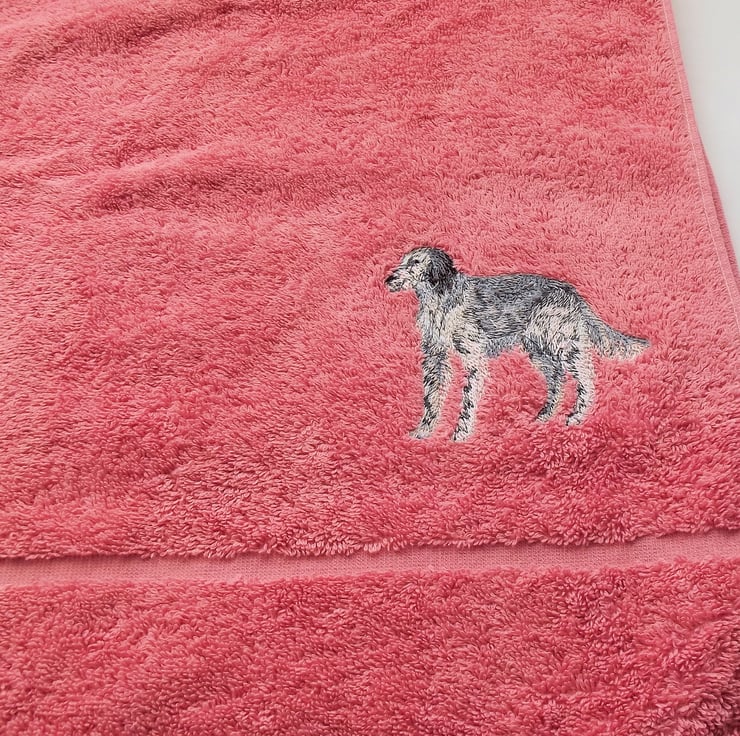 Machine Embroidered by me. English Setter dog design machine embroidered Hand Towel. Dusky Pink. Towel measures 50cm x 90cm. 100% Turkish Cotton. t15