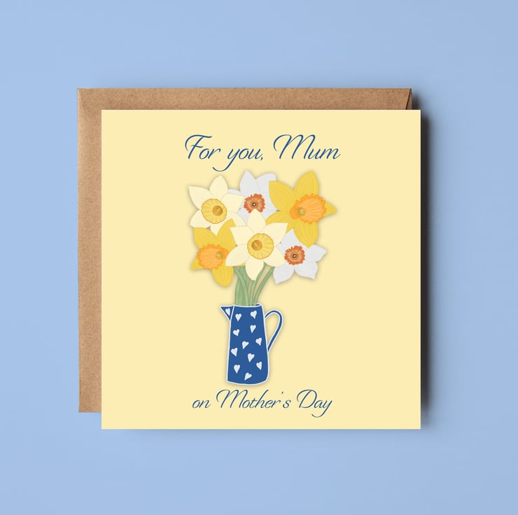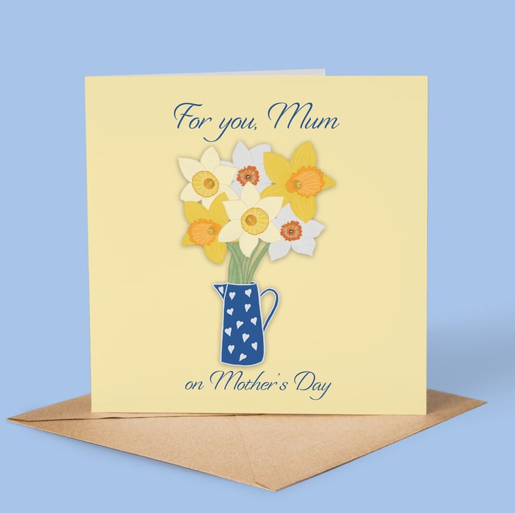 Joyful Mother's Day card featuring a jug of bright and happy daffodils. The greeting says,