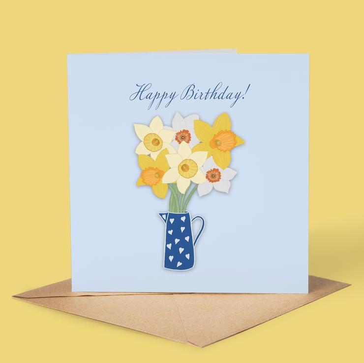 Joyful birthday card featuring a jug of bright and happy daffodils. The greeting simply says "Happy Birthday!" on the front.