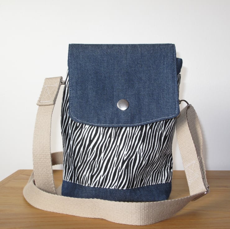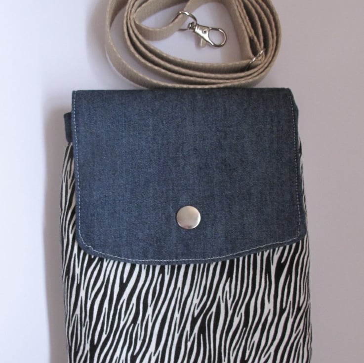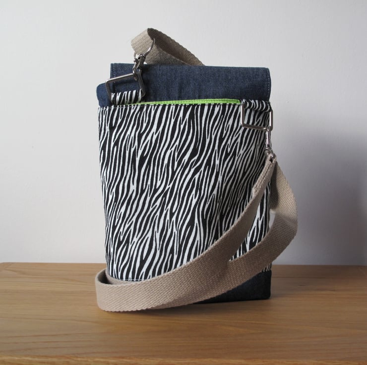 The exterior is made of medium weight blue denim cotton fabric and two cotton fabric panels featuring a black and white zebra design.