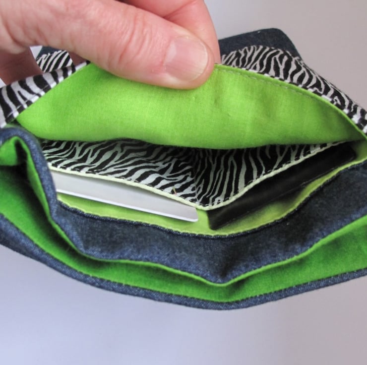 The interior is lined with various shades of green cotton fabric. The card slots and slip pocket in the main compartment are eye-catching in the zebra design.
