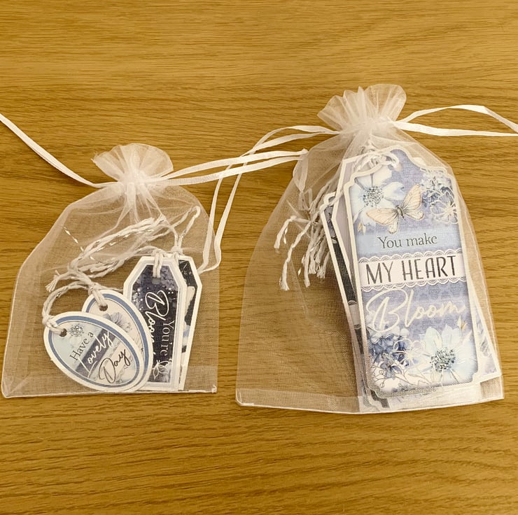 The tags are placed inside white organza bags & will be dispatched in a bubble lined envelope.