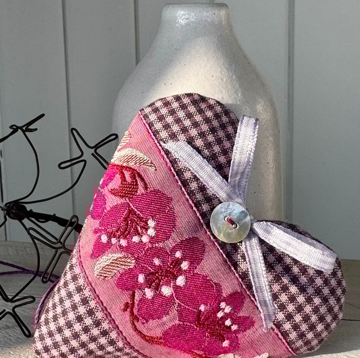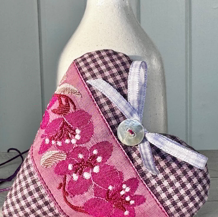 Filled with scented lavender and finished with purple hemp twine hanging ties, a mother-of-pearl button and a pale purple gingham ribbon bow.