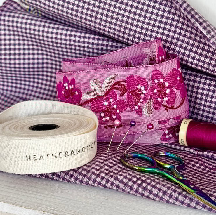 In soft purple mini-checked gingham and with a beautiful woven ribbon featuring a cascade of pink blossoms.