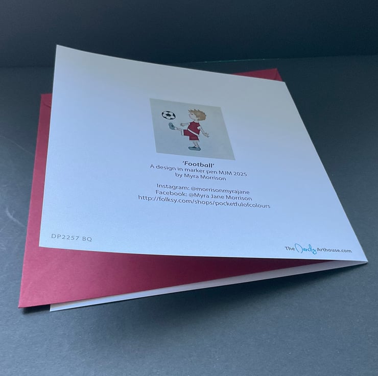 This marker pen and ink greetings card is blank inside for your own message .It features a cute child with a football. The card would be suitable for a birthday , friend ,relative ,thank you ,or maybe a sports fan .