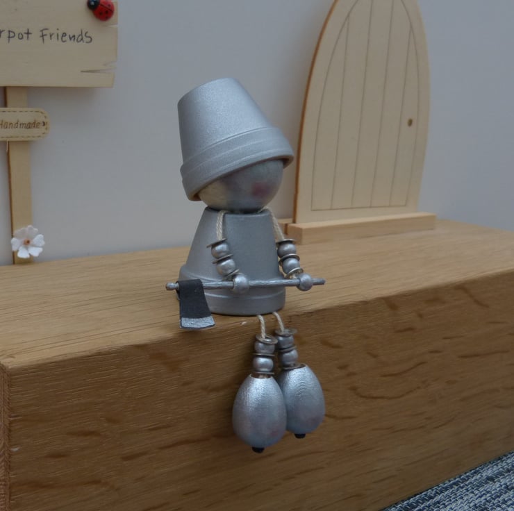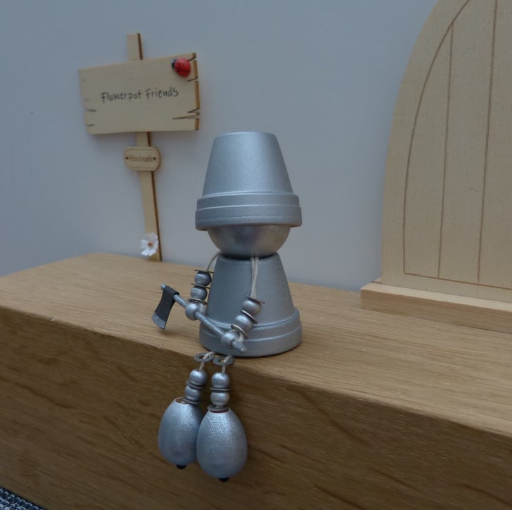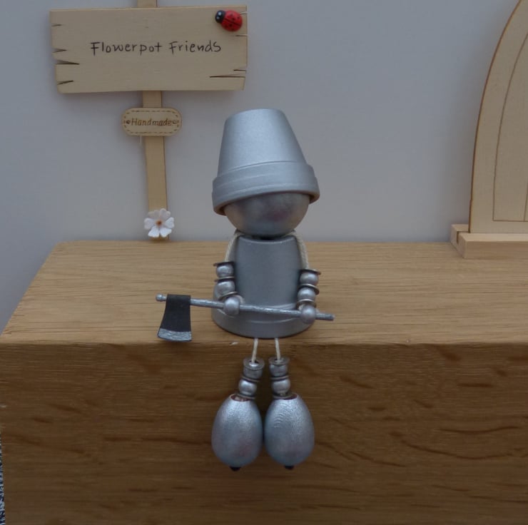 Sprayed silver with metal washers and a hand made wooden axe this terracotta Flowerpot Friend is hoping for a call for the next Wizard of Oz pantomime.