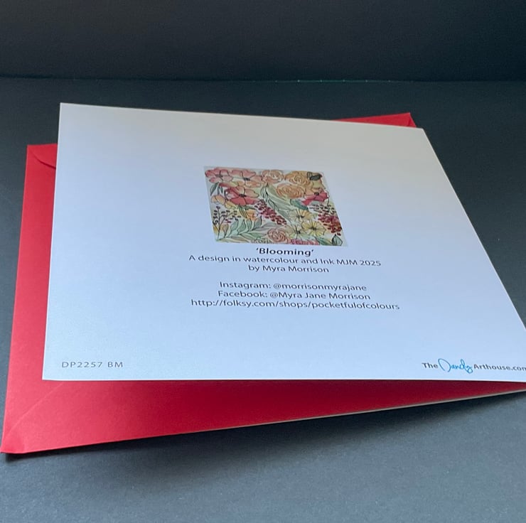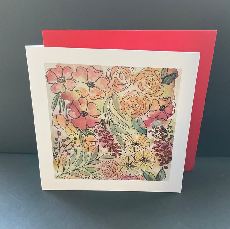 This watercolour and ink greetings card is blank inside for your own message .This is a modern floral design . The card would be suitable for a birthday , friend ,relative , as a thankyou card , or maybe for a keen gardener