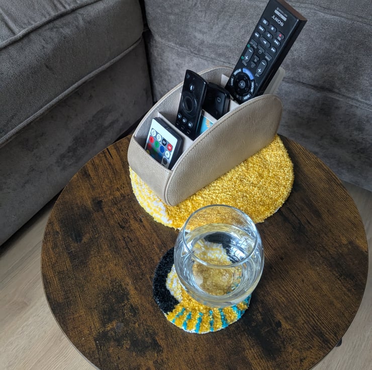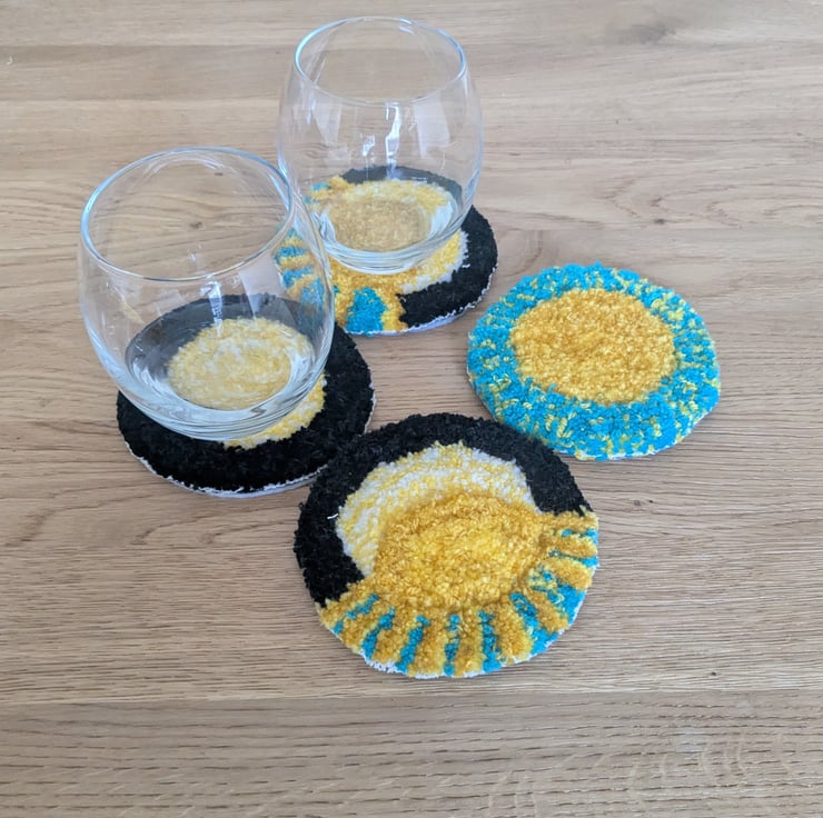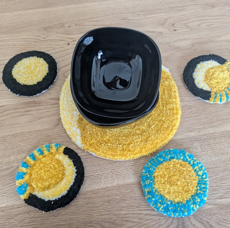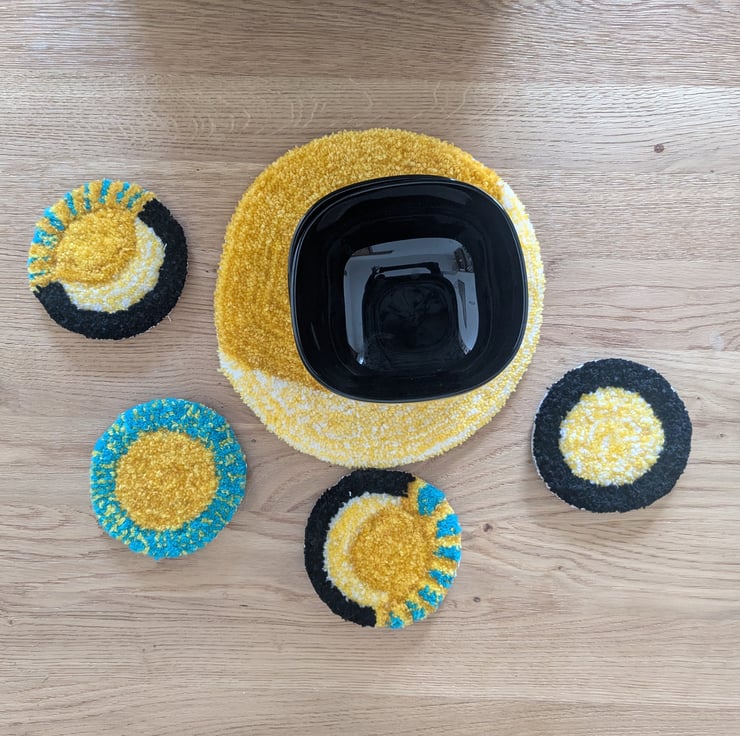 This bundle consist of a 4 coasters and a larger centre piece. Featuring bright vibrant colours and reflections of nature. handmade items using a punch needle.