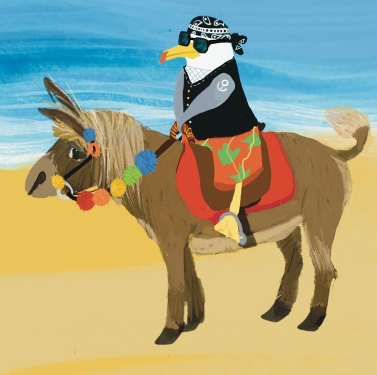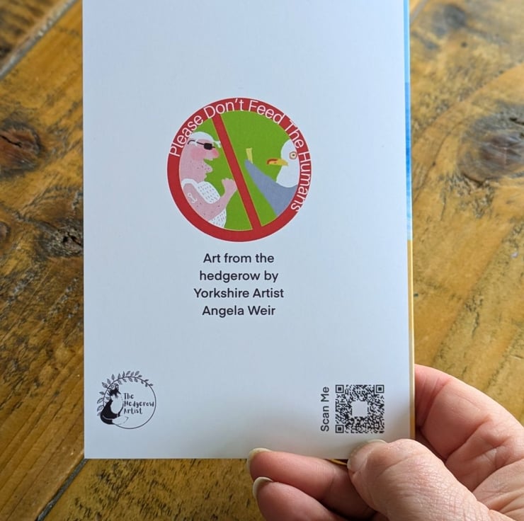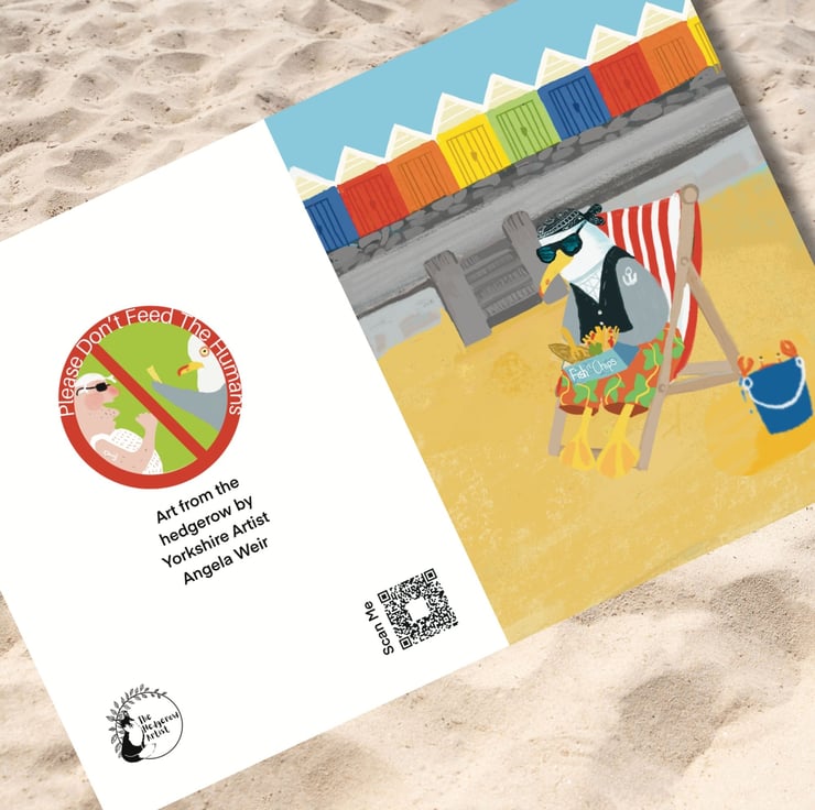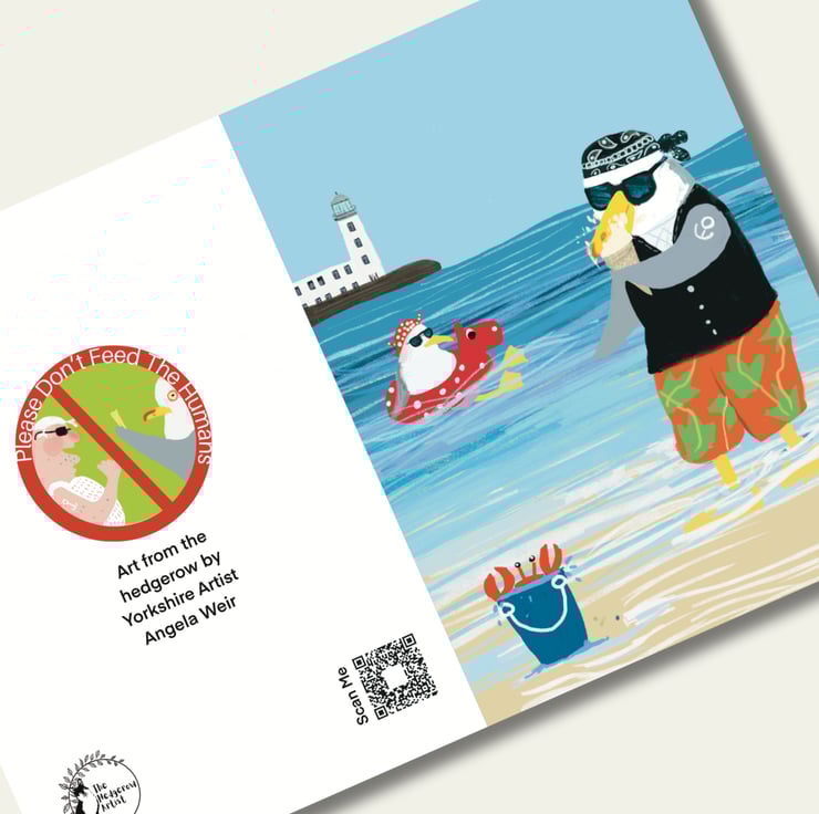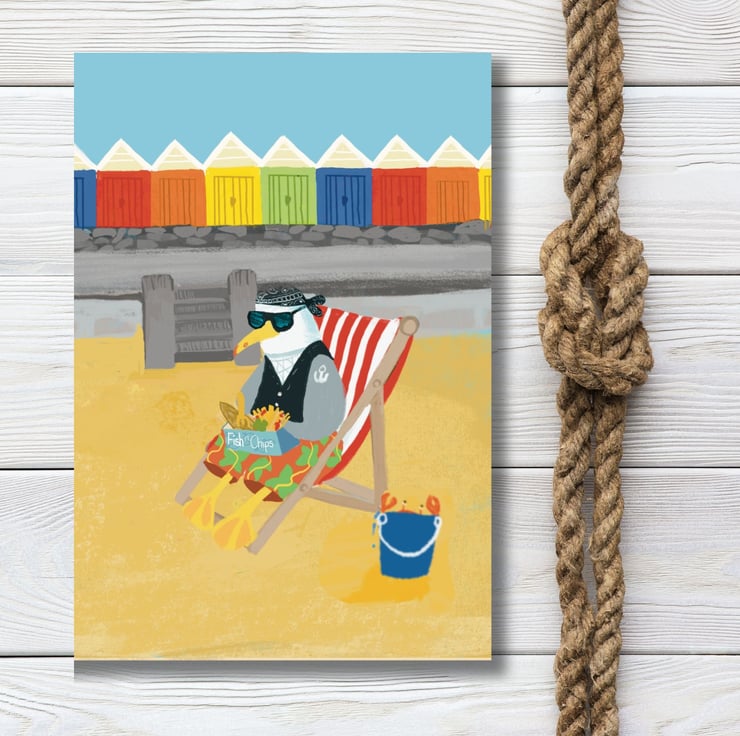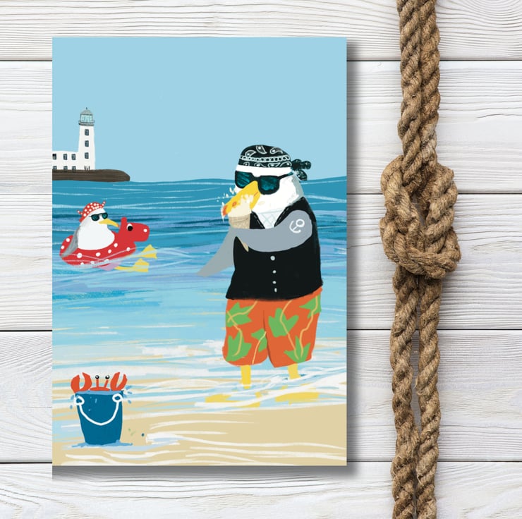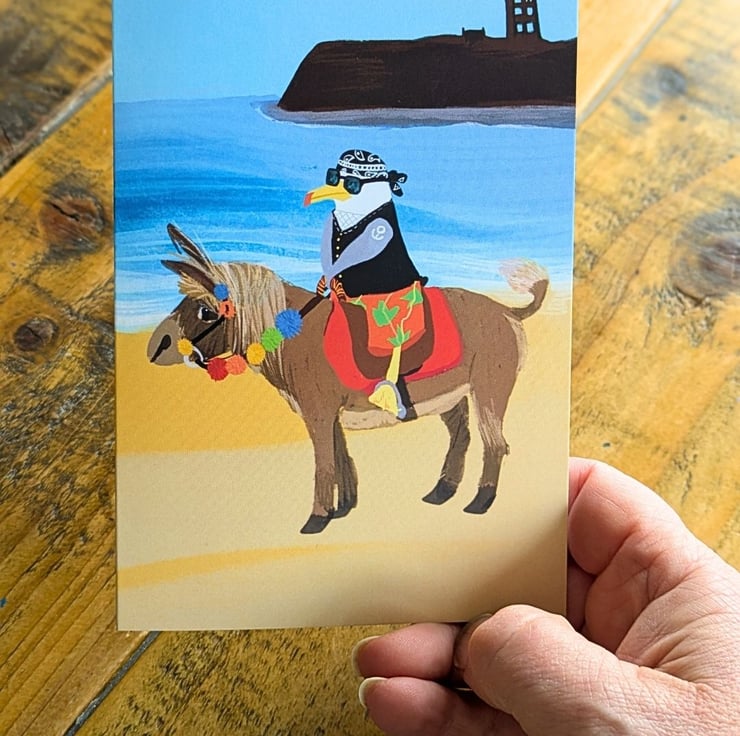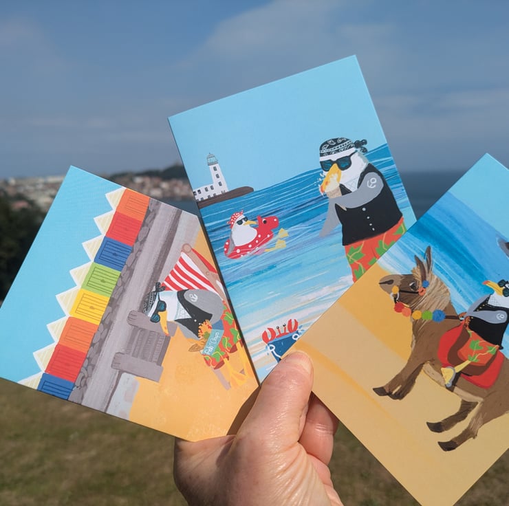 A set of bright colourful cards of my favourite herring gull on holiday in his favourtie seaside town Scarborough. He has fun eating fish and chips at the beach huts, a paddle in the sea with his ice cream and a ride on a donkey. Great to send out a little greeting which will make people smile.