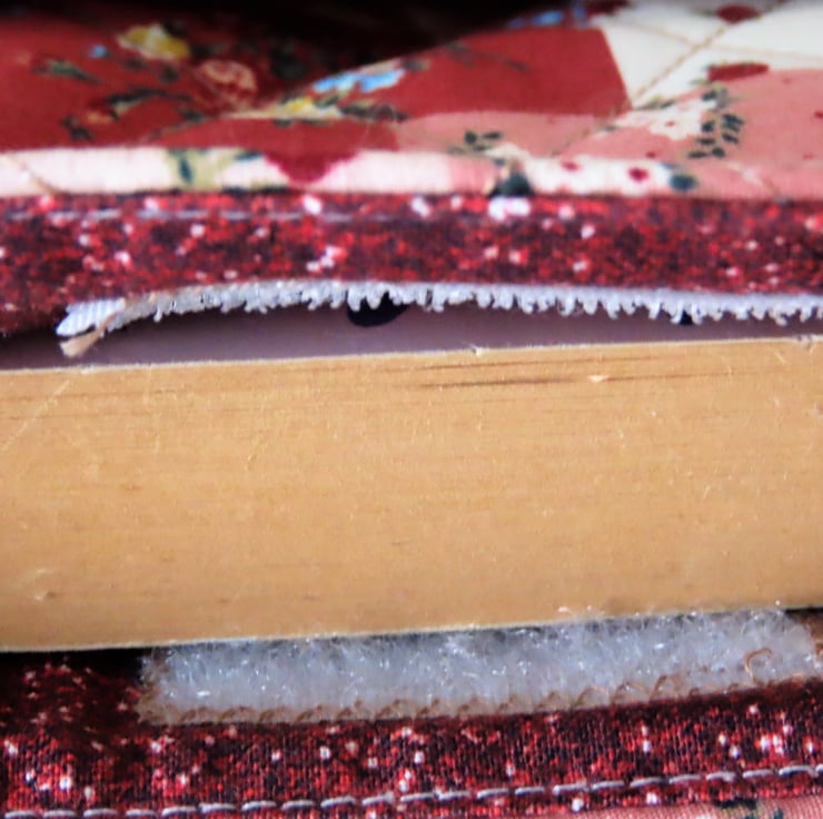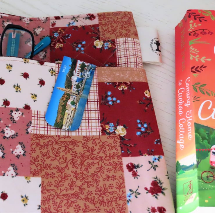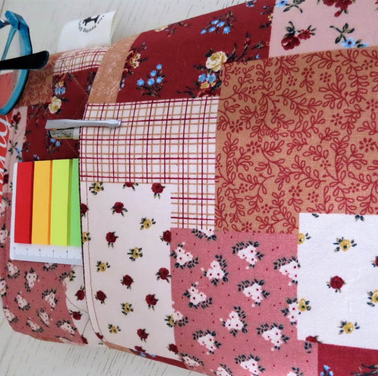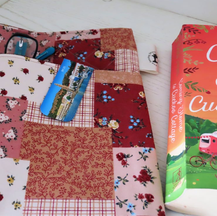 The fabric is quilted to make the sleeve slightly padded to protect your book. The fabric has a faux patchwork design in brick red and beige. The sleeve has a front pocket to safely store a pen or a bookmark etc. The sleeve fastens with a Velcro strip and measures 19cm wide x 24cm long.