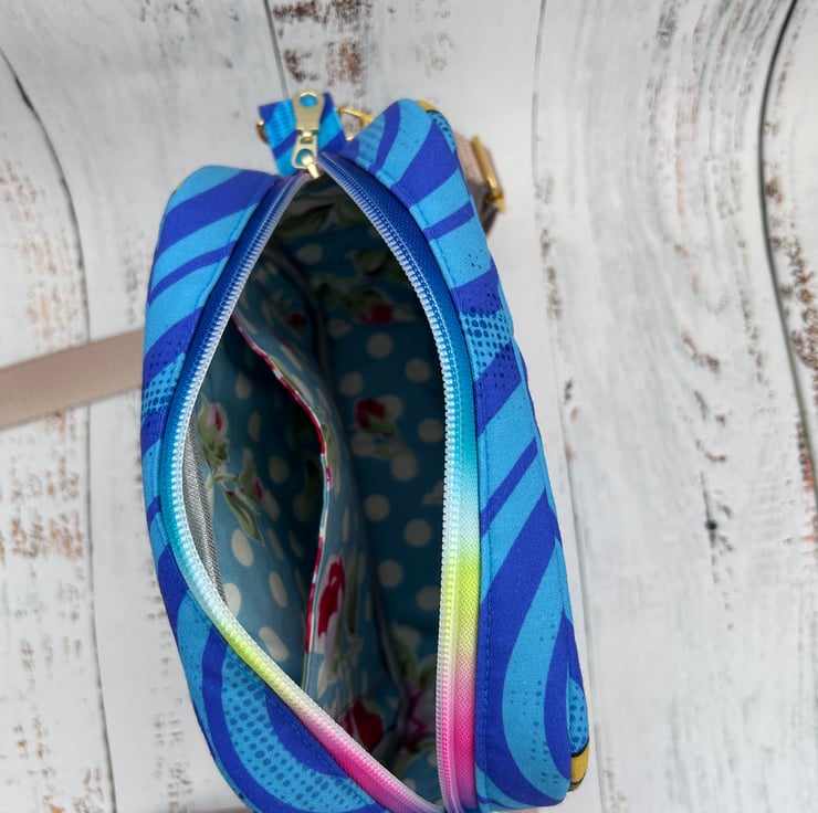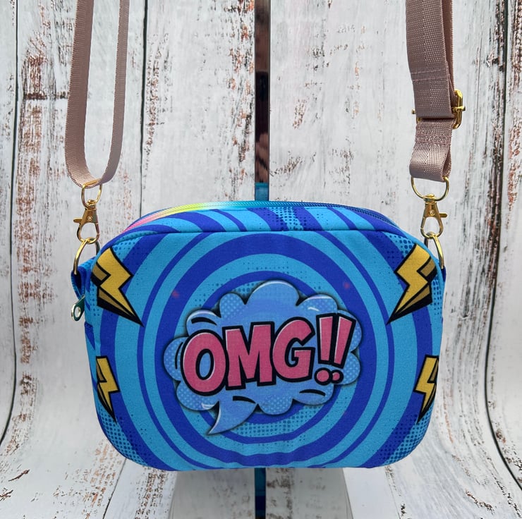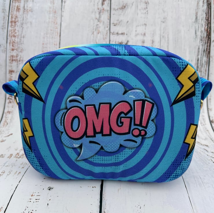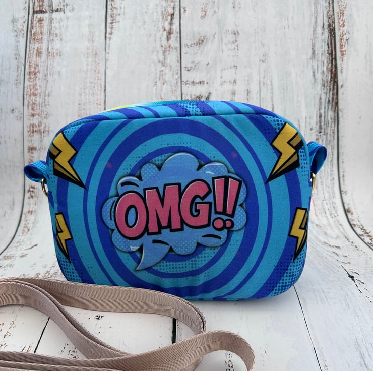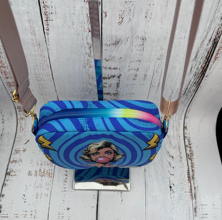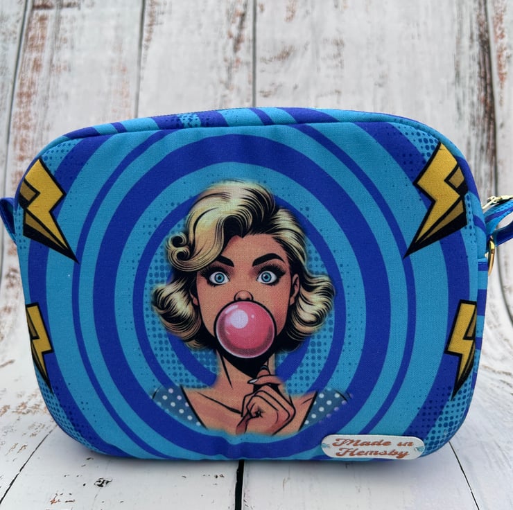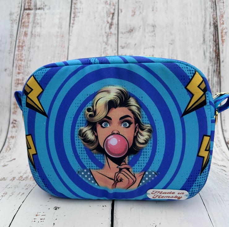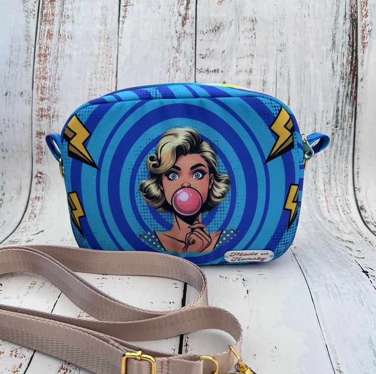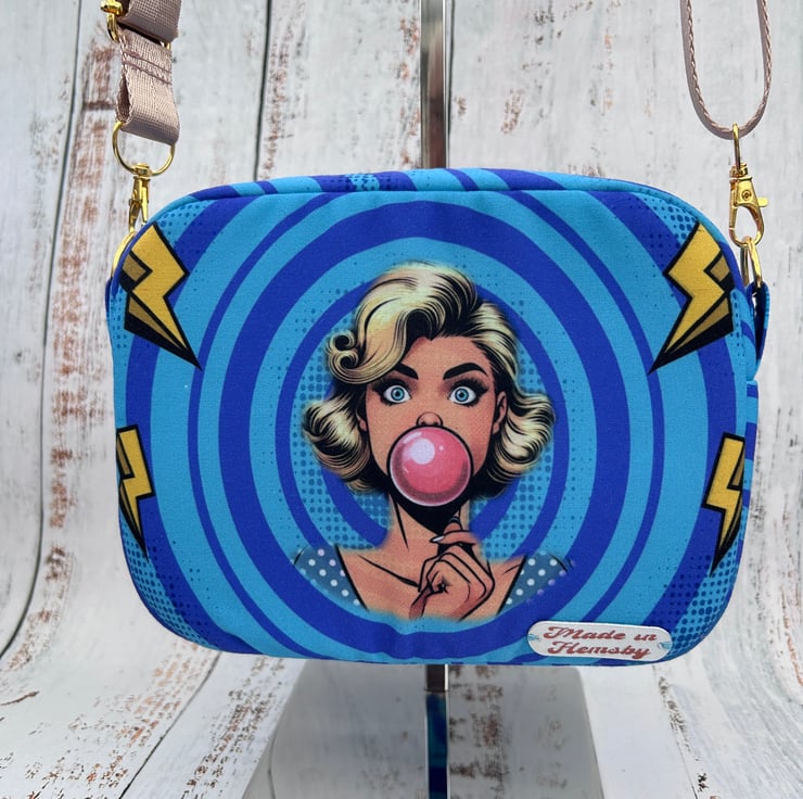 Add a touch of individuality to your style with our unique cross-body bag, featuring vibrant pop art designs on each side. Crafted from bespoke printed fabric with a soft cotton-feel polyester, this bag is both stylish and functional.