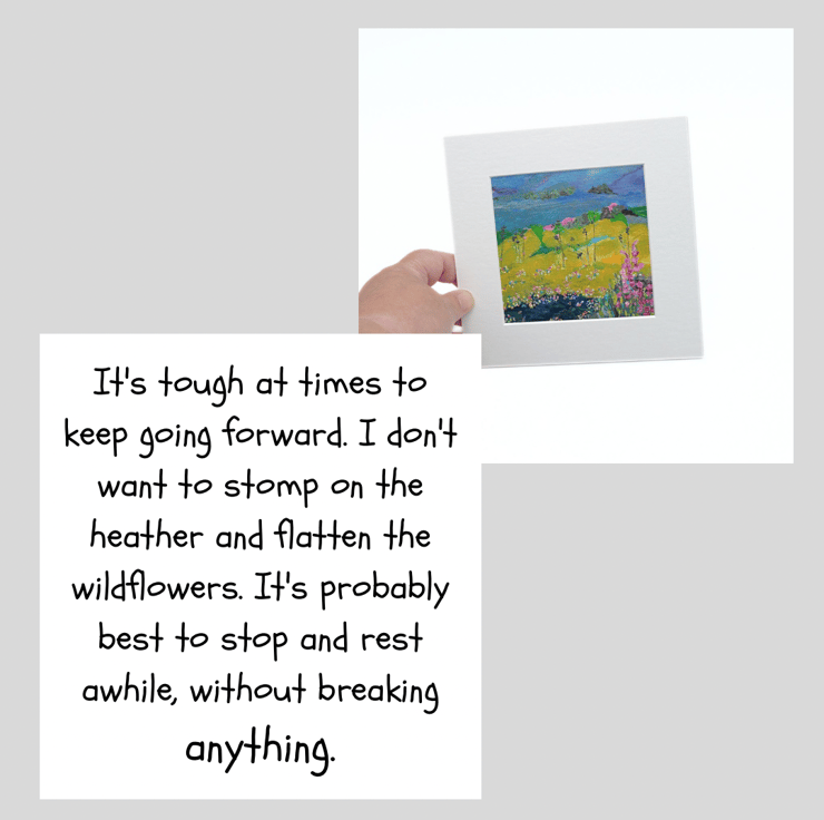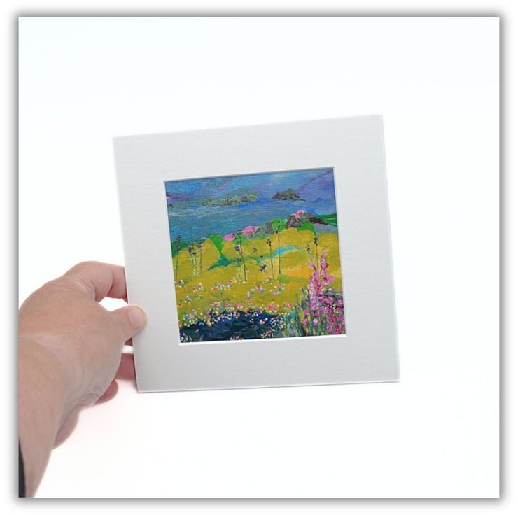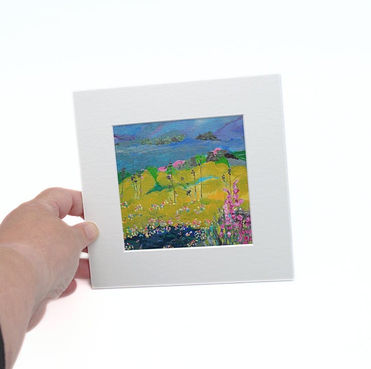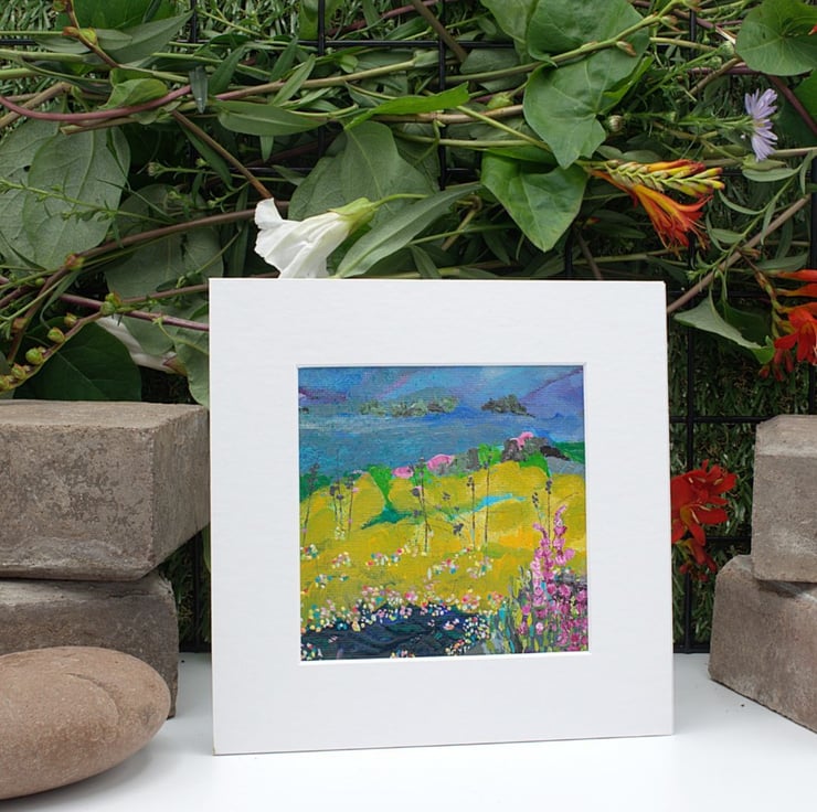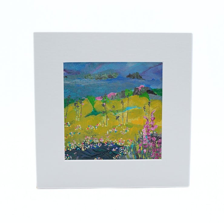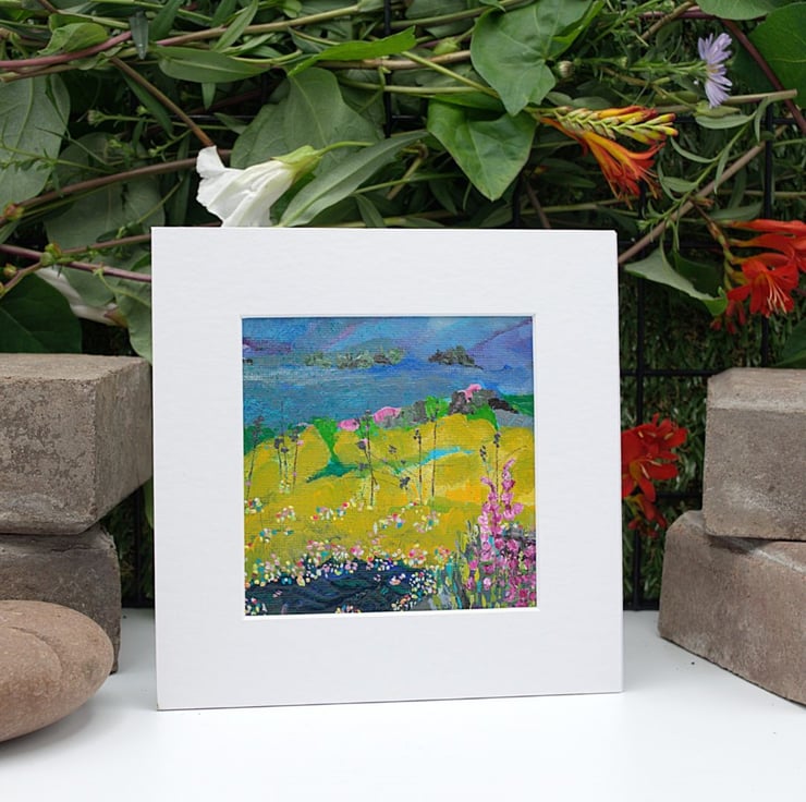This is a small mounted abstract painting. This colourful landscape has a blanket of wildflowers and grasses in the foreground. I have used professional quality acrylic paint with flat brushes to outline the rolling hills in the background. I have scratched into some areas with an old nail to give texture.