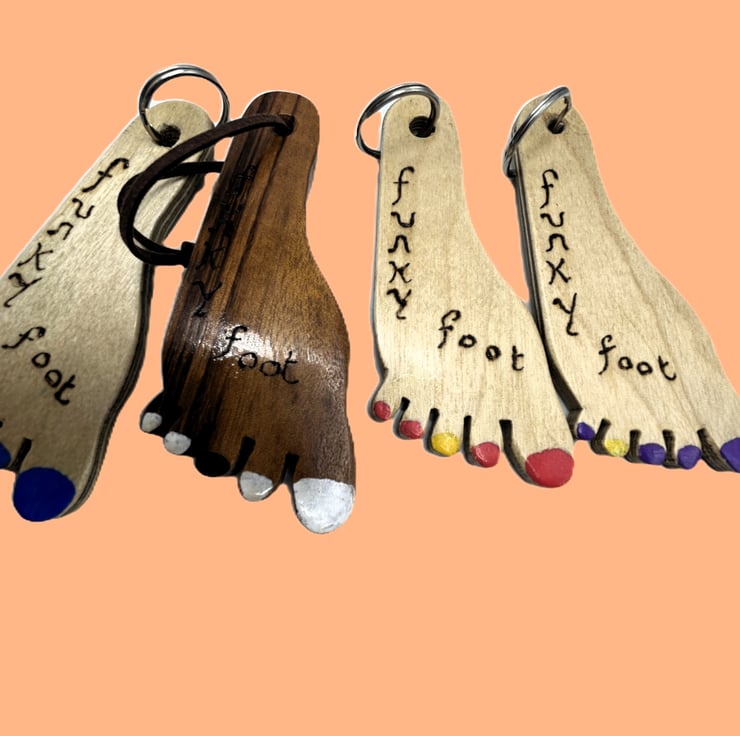This funky foot was cut on a fretsaw and sanded down to a smooth surface. I painted the toes using permanent paint markers and pyrographed the funky foot logo, then sealed it using sanding sealer and finally buffed using a vegan friendly carnauba wax polish. We have different toe nail colours and woods, either light coloured birch plywood or darker Tigerwood.