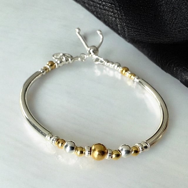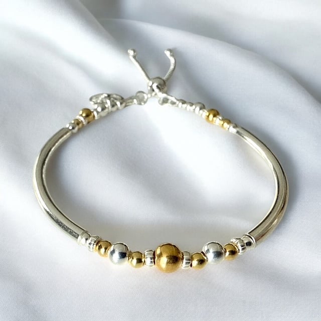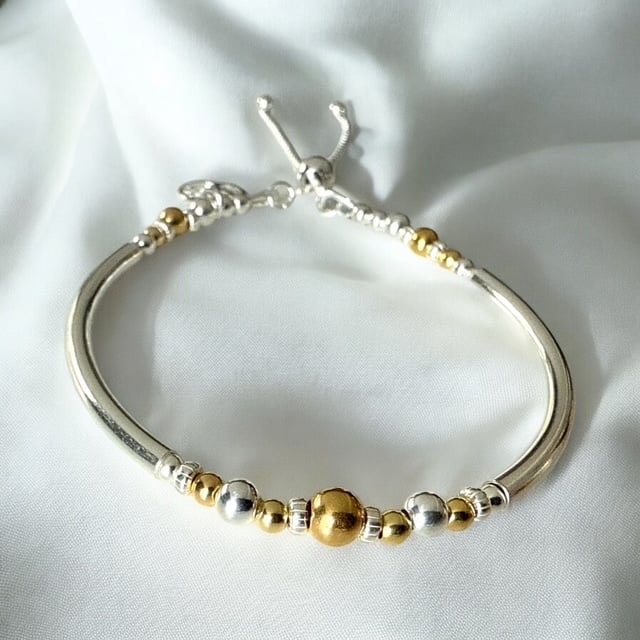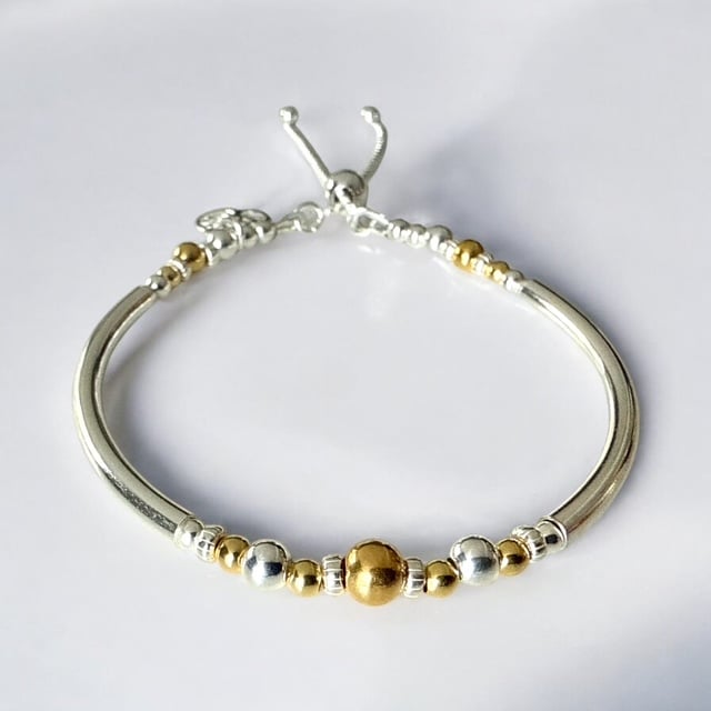 Vermeil Gold and Sterling Silver Bracelet made with 3mm and 5mm Gold Vermeil beads, with Sterling Silver round and tube beads. I attached the Sterling Silver 10mm Tree of Life charm to the end of the bracelet. The bracelet gives the look of a bangle but with the flexibility of a bracelet. I finished the bracelet with a Sterling Silver slider clasp.