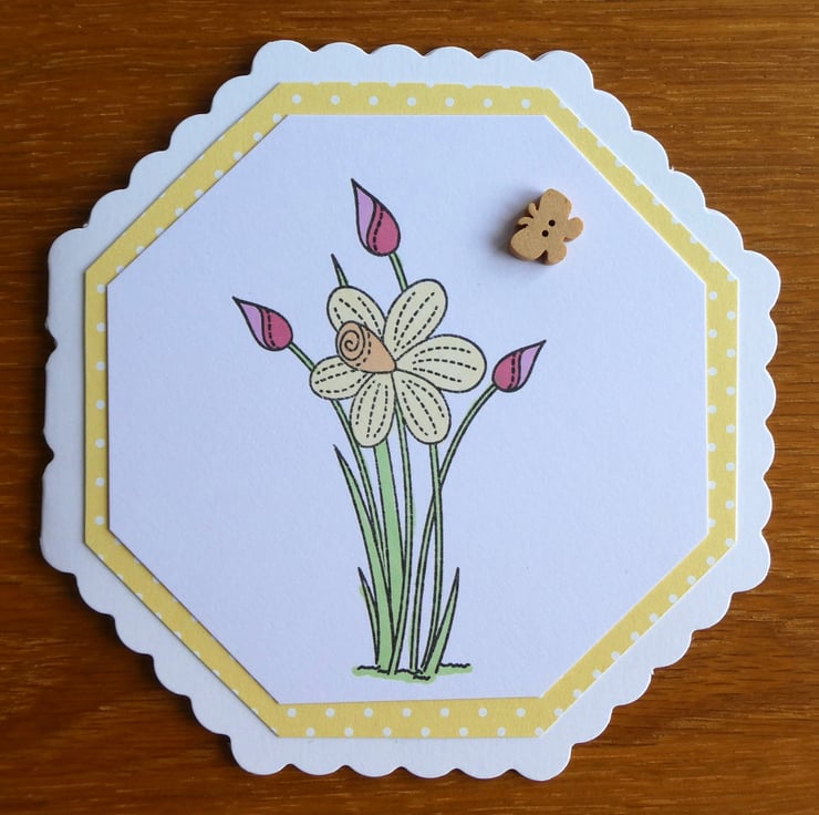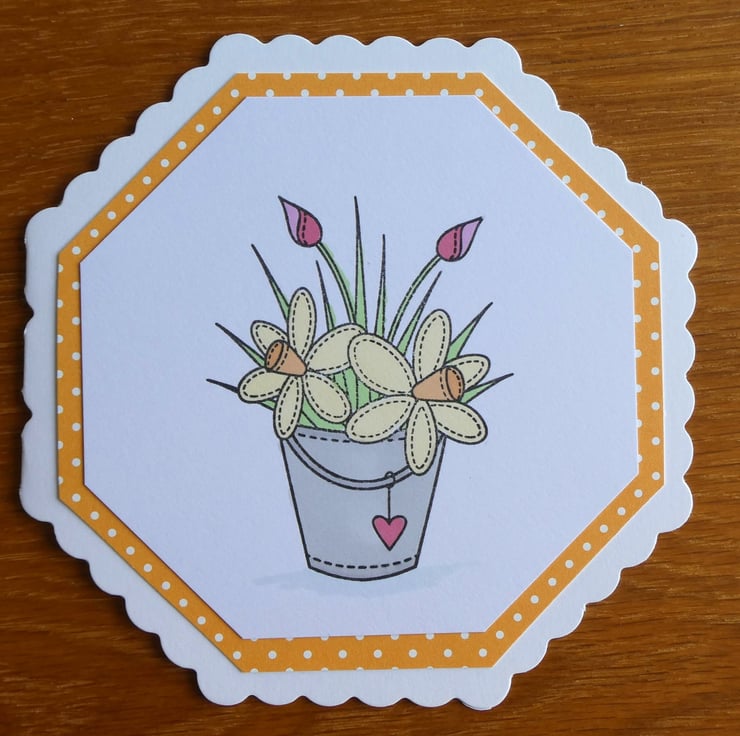 All of the designs are hand stamped and coloured and are mounted onto polka dot card in either green, orange or pale blue and then onto octagonal white scalloped edge cards approximately 12cm at the widest points.