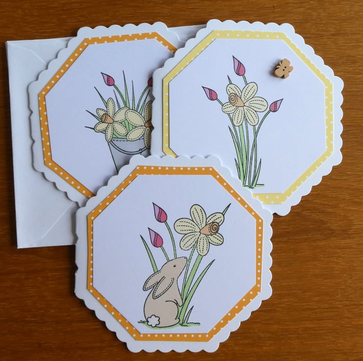 This pack of Easter cards includes one each of 3 designs featuring hand stamped and coloured images of spring daffodils, tulips or hares.
