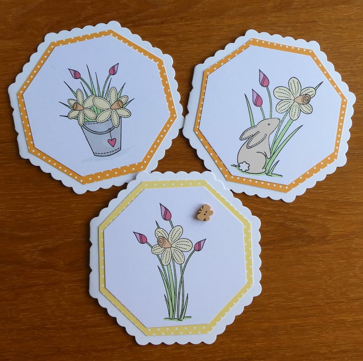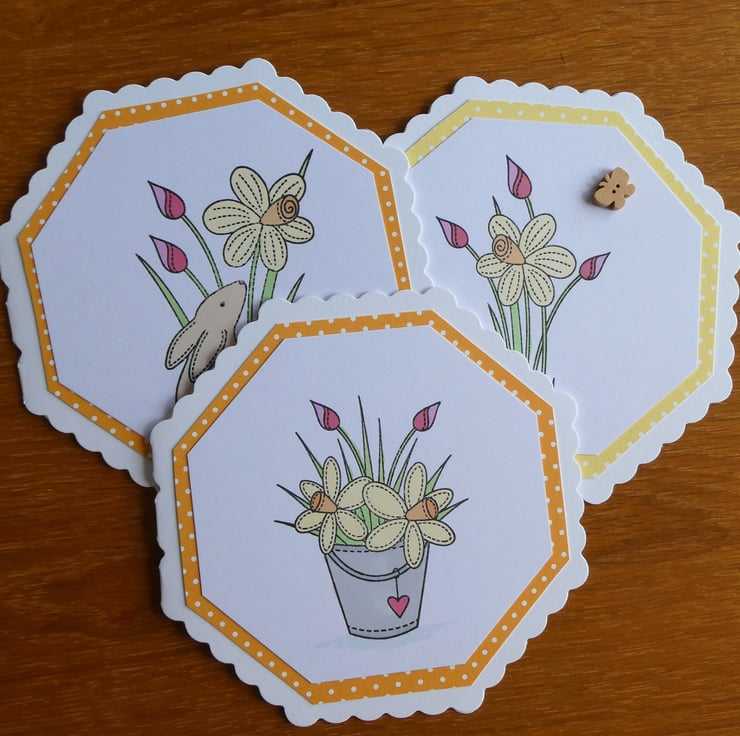 One card has an image of a silver bucket filled with daffodils and tulips with a pink heart hanging from the handle, one has a hare sitting in front of a daffodil and 2 pink tulips, and the third has a daffodil with 3 tulips with a wooden button in the shape of a butterfly.