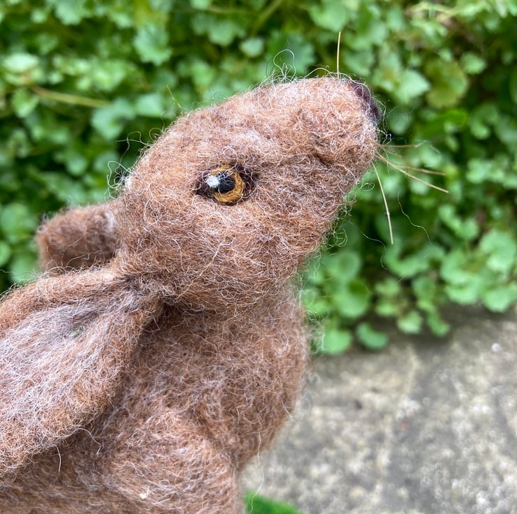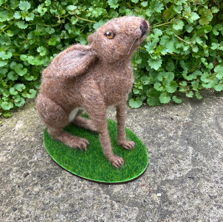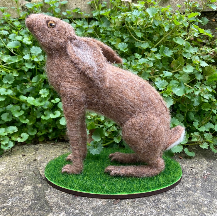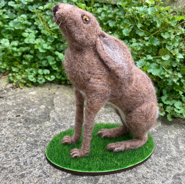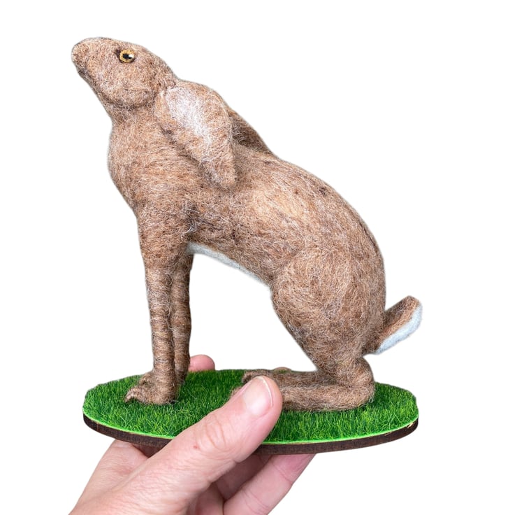 A moon gazing brown hare sitting on a grass covered base has been created using a needle felting technique. A barbed felting needle is used to bind a sculpt core woollen fibres into shape. A top coat in appropriate colours is then added to thhe body and legs, ears and a bob tail added. The feet and legs have been formed by wrapping wool over wire to add strength and stability. The eyes are needle felted and horsehair whiskers have been added. The hare has been mounted on an oval shaped piece of plywood covered in artificial grass.