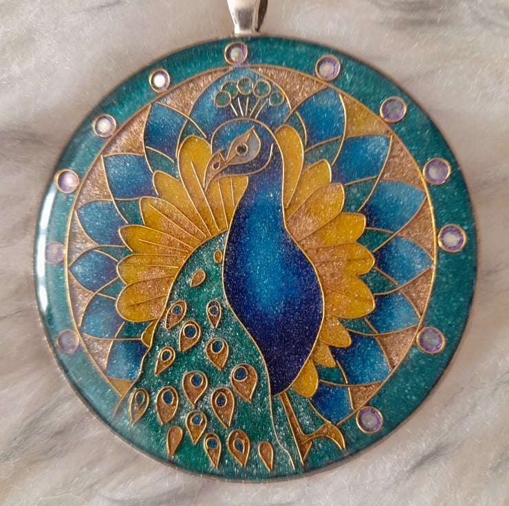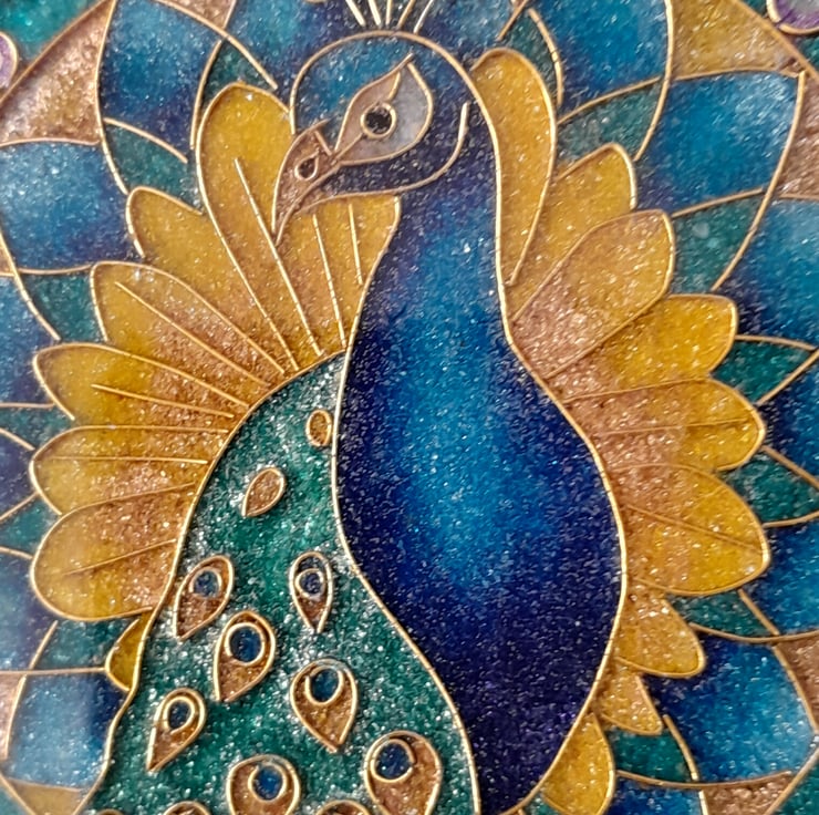 A round image of a cloisonne peacock featuring intricate metal work and specialist sand colours. The peacock has a detailed decorative design with gold wire outlines separating the vibrant sections.
