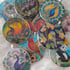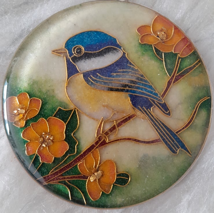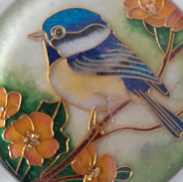 A round image of a cloisonne style blue tit featuring intricate metal work and specialist sand colours. The blue tit has a detailed decorative design with gold wire outlines separating the vibrant sections.
