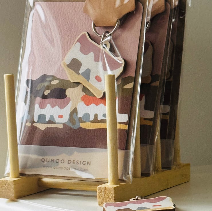 - one (1) card with rounded corners, the inside is blank, A6 card size 148mm x 105mm supplied with a brown (kraft) recycled envelope and one (1) wooden keyring 50mm x 40mm approx.