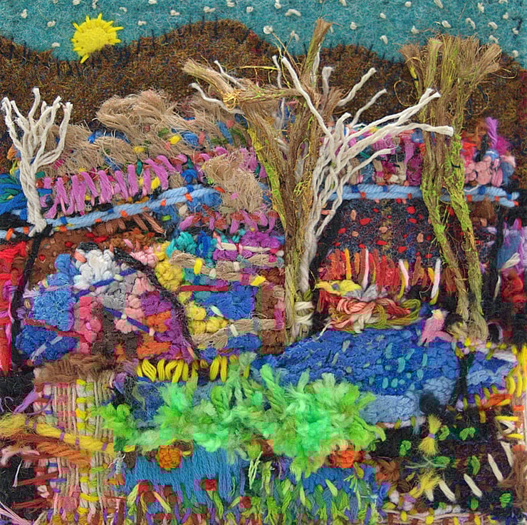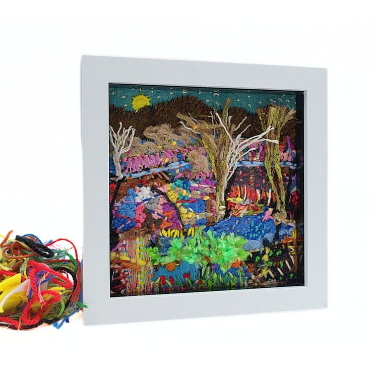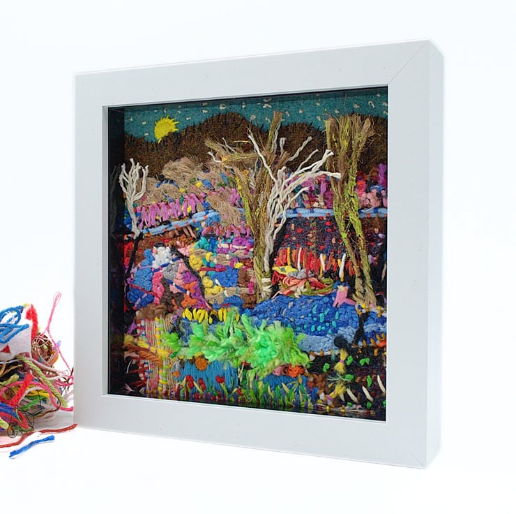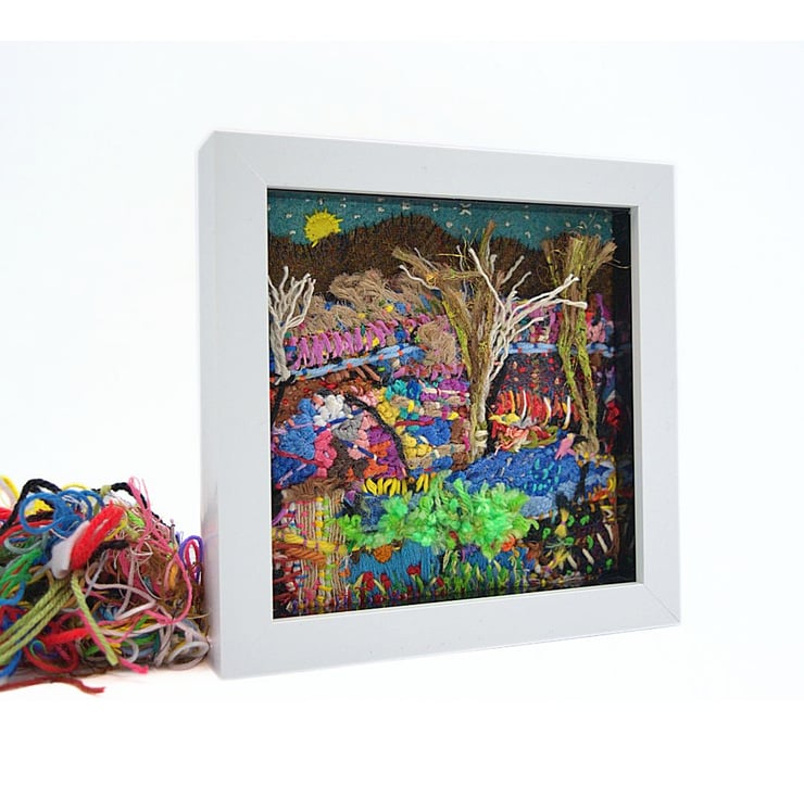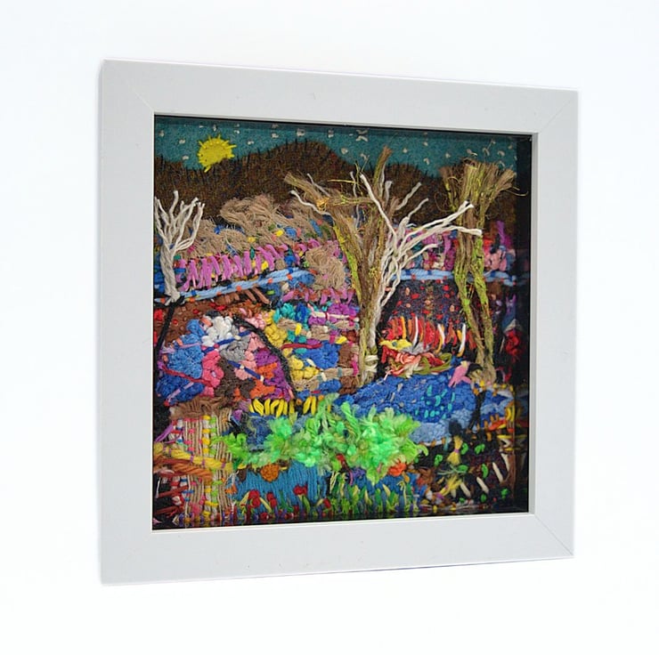 This is an original framed textile landscape. It shows a warm sun poking out over the hills. In the foreground we have a loch, some foliage, flowers and trees. Each stitch has been completed by hand using a variety of silk and wool threads.
