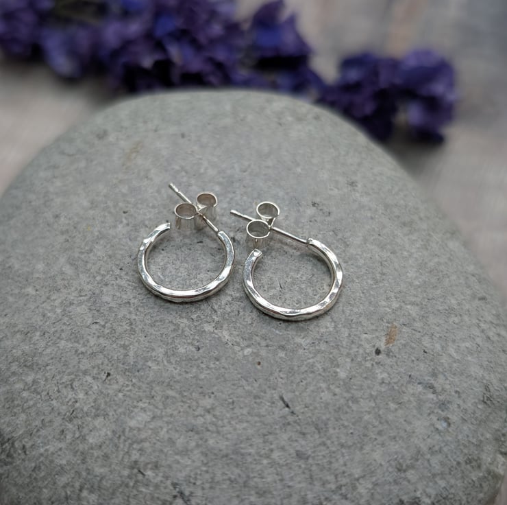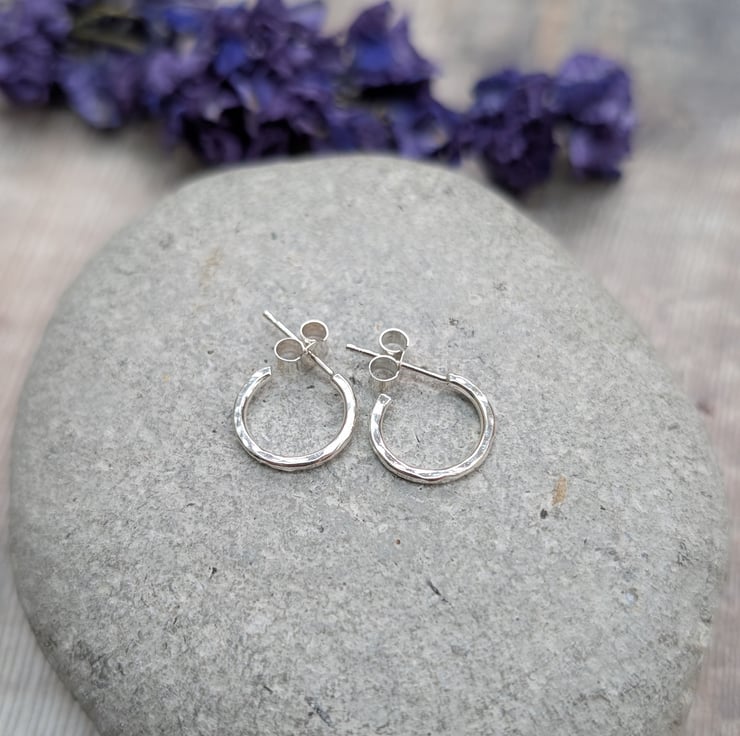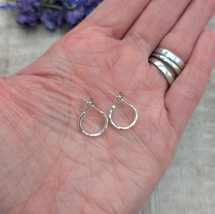 These small hammered hoop earrings are handmade from recycled sterling silver and designed for everyday wear. The hoops measure approximately 12mm in diameter, with a lightly hammered surface that reflects the light beautifully. Simple, subtle and easy to wear, they fasten with secure sterling silver posts and butterfly backs.