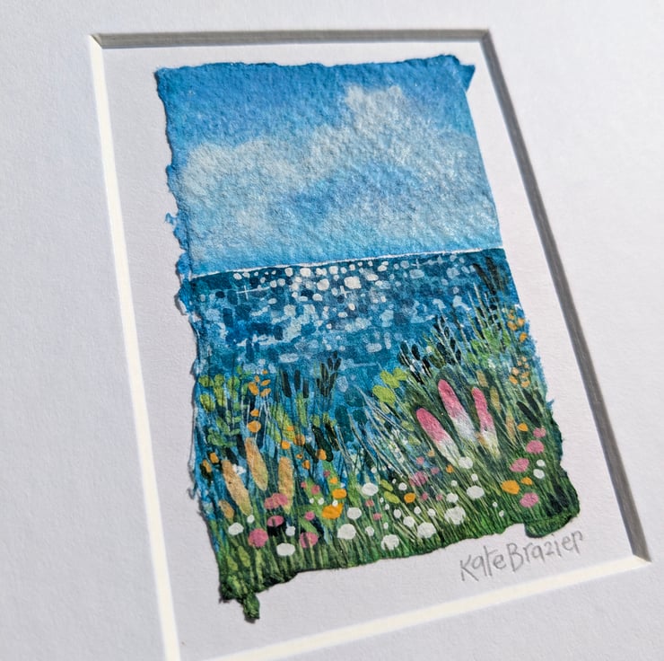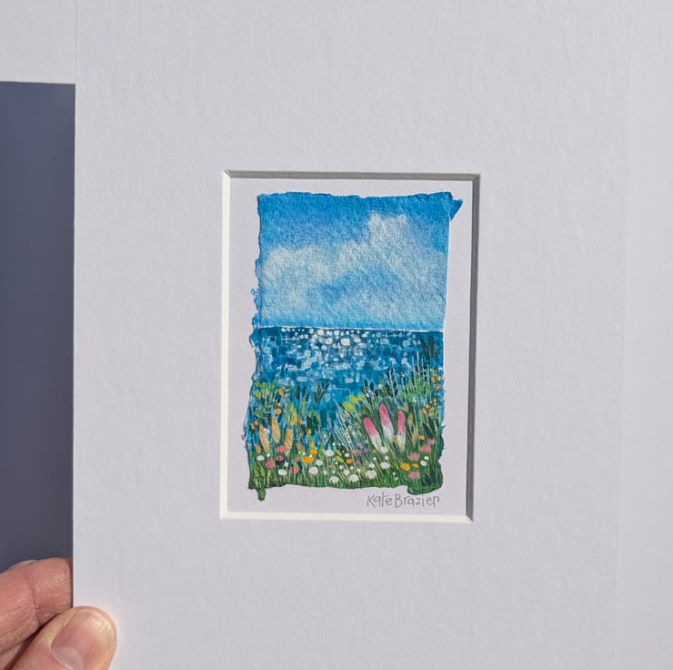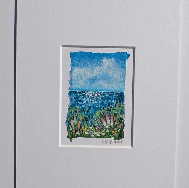 The sun sparkled on the waves - Original miniature. A5 Mounted