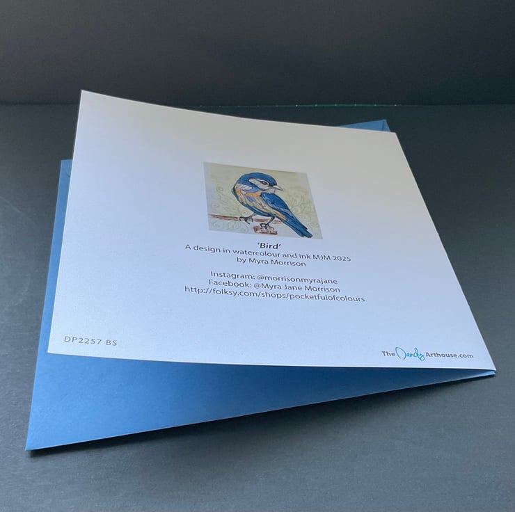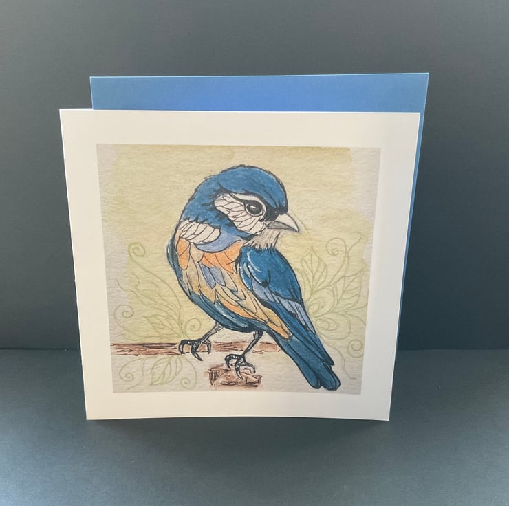 This watercolour and ink greetings card is blank inside for your own message ,and features a bird sitting on a branch. The card would be suitable for a birthday , friend ,relative , as a thankyou card , or maybe a bird lover