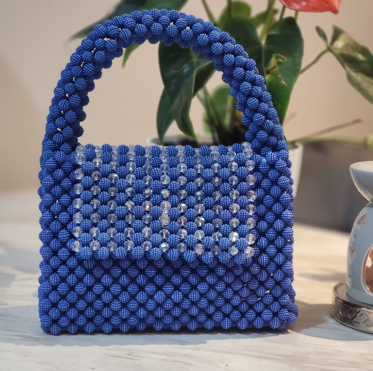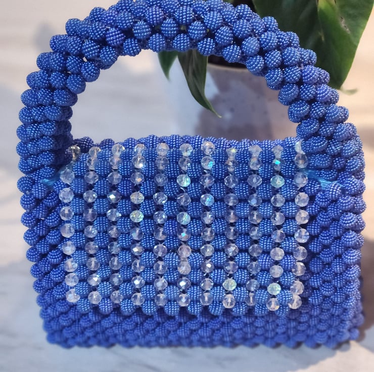 Blue handmade beaded handbag with a soft velvet blue inner lining.