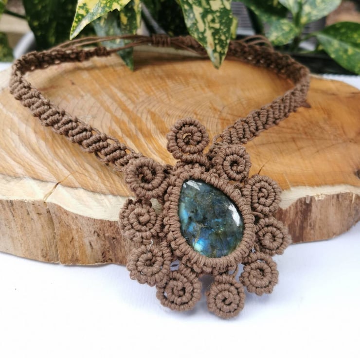 One of a kind statement necklace made with dark brown hand dyed hemp cord woven into a swirl design. This elven necklace is vegan-friendly, eco-friendly, and made with only natural products.